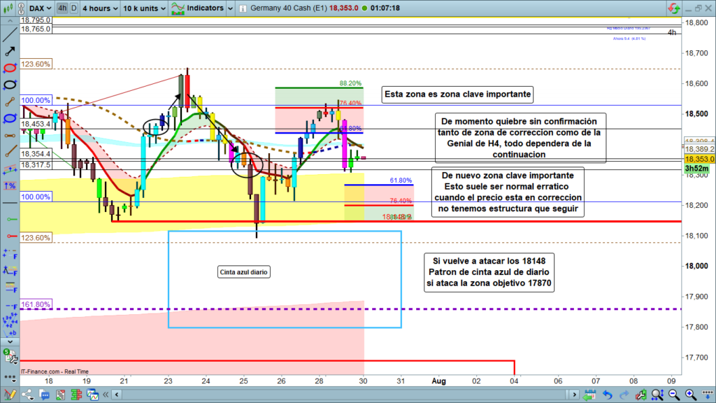 Ayer, el precio se volvió a comportar como era de esperar en un lunes, además veraniego, nada que ver con lo ocurrido la semana pasada. Tal como pronosticaba, lo más probable era lo que acabó ocurriendo rebote en la zona clave para bajar con quiebre de zona de corrección y genial line de H4, sin confirmar y vuelta de nuevo a zona de corrección. Inicio del día, en la zona de los, 18500, para acabar cerrando el día cercano a la zona de los 18380.