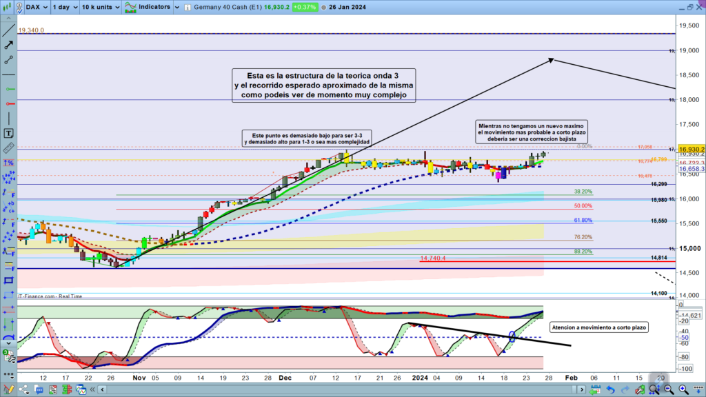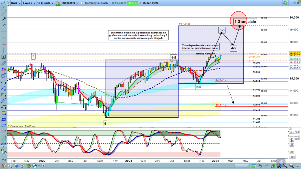 En gráfico semanal, tenemos detalle de la parte de la estructura en curso, y podemos ver como se podría también repetir una posible situación de onda 1 extendida de nuevo. Sin embargo, aún no tenemos suficientes datos, es solo una posible percepción, después del recorrido de la onda 1-5, o tenemos unas velas menores, o sea onda 3 menor que onda 1, y, por tanto, onda 5, menor que onda 3, o, por el contrario, vamos a máximos con una onda 3, normal proyectada un 161,8%, y la consiguiente onda 5, de final de estructura.