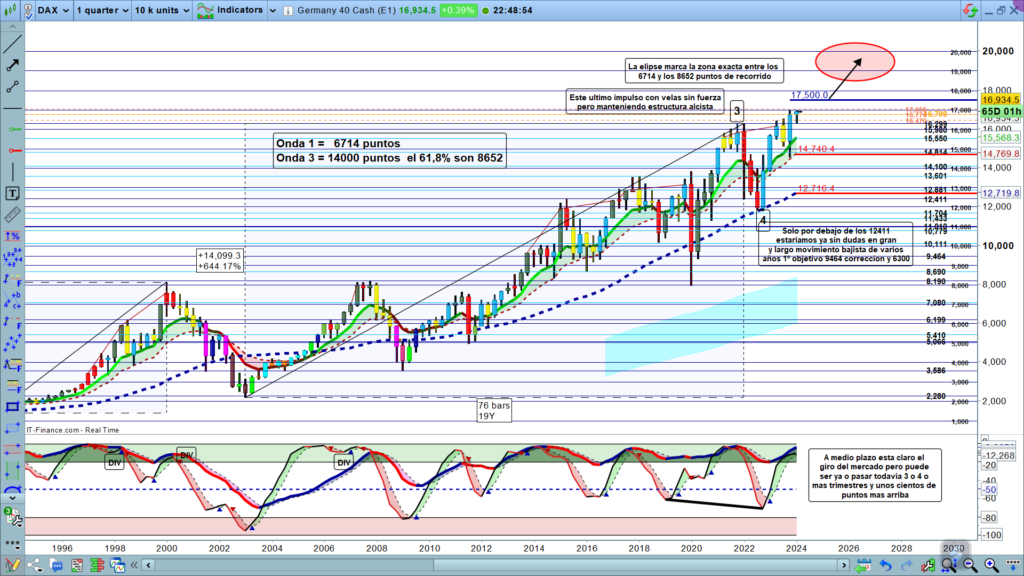 La proyección del último movimiento, tal como vemos en gráfico trimestral, es entre la zona de los, 19000 y los, 20500. Teniendo en cuenta la regla de que la onda 5 es igual que la onda 1 o el 61,8% de la onda 3. Como vemos en trimestral, las velas son sin fuerza, movimiento típico de las ondas 5, justo hasta el momento de final de estructura que suele entrar fuerza para acabar estructura y hacer el giro.