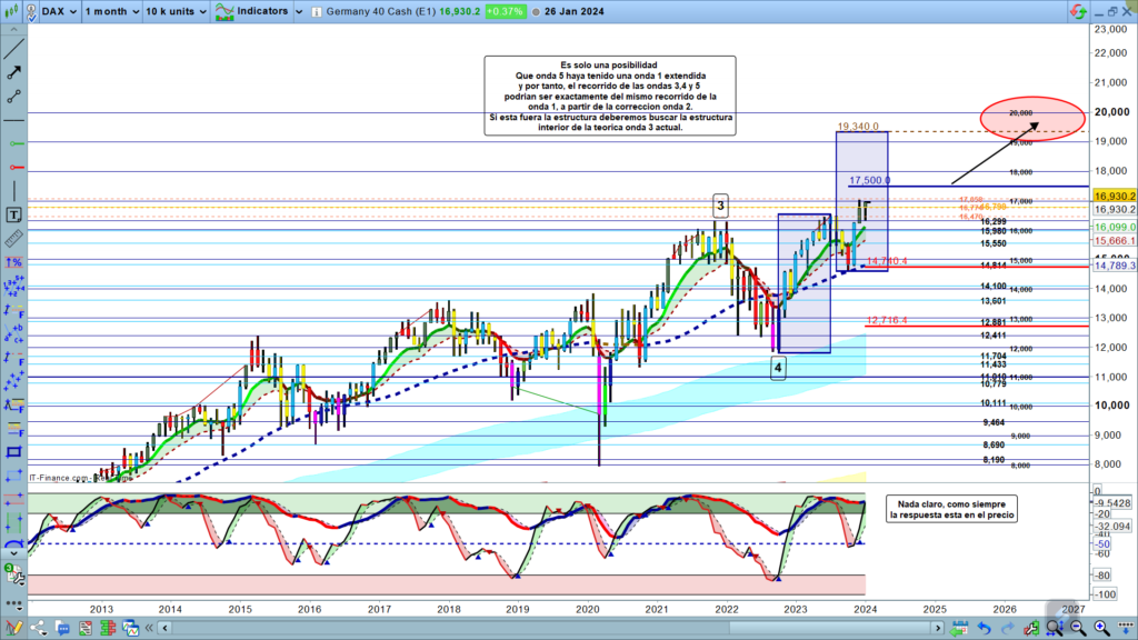 En gráfico mensual, además distinguimos una posible estructura de onda 1 extendida, si fuera este el caso, las ondas 3, 4, y 5, realizarían un recorrido igual o similar al de la onda 1, siendo obviamente la onda 3, mayor que la onda 5. Si proyectamos este recorrido de 3, 4, 5, desde final de onda 2, obtenemos una nueva zona donde es posible que finalice la estructura. Esta zona estaría en los 19340 a 19500. en medio de la zona de posible final de estructura.