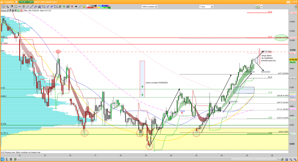 Después del segundo día de rallye en el DAX llegando el futuro de ayer a subidas de casi el 12% intradía, superando los 9.550 puntos que planteamos como objetivo alcista, nos encontramos hoy en posible continuidad de la corrección de la bajada, aún en fase de rebote.