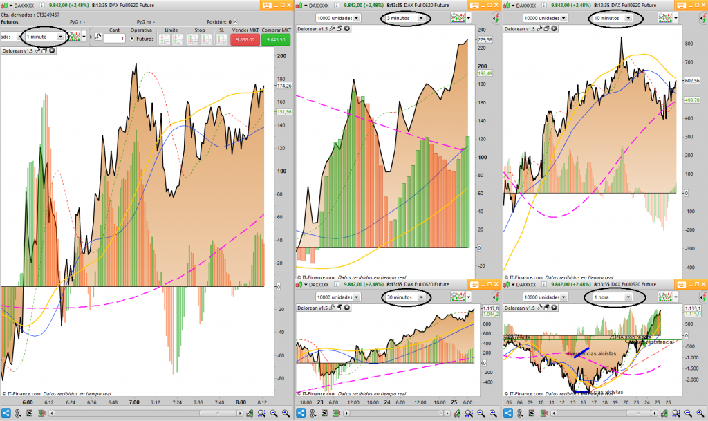A nivel de mi indicador DELOREAN en todas las franjas de tiempo intradía o de medio plazo, 1min, 3min, 10 min, 30 min y 1h se mantiene: