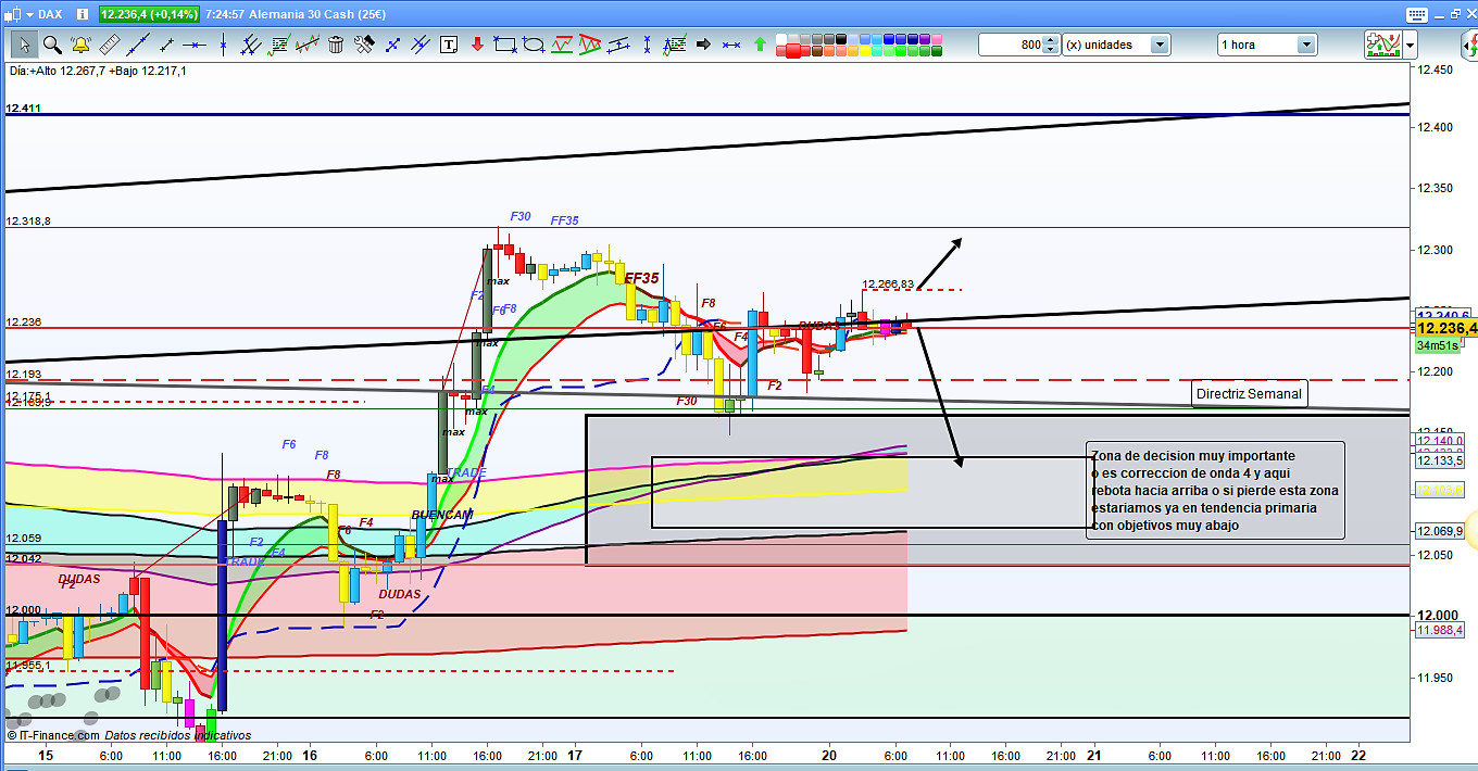 En gráfico de 4 horas del dax30 poca cosa a destacar. La cotización dax está en ciclo alcista, y vuelta a la zona de corrección de 4 horas. Si rebota en esta zona con claridad, recorrido hasta 12411. Si, por el contrario, quebrara y confirmara la zona de decisión del día, muy posible vuelta a 11876, y allí es donde empieza la zona de fuerte soporte del gráfico diario. Por lo tanto, si llegara, muy posible rebote de primeras. Detalles para la operativa de corto plazo, en los próximos gráficos menores.