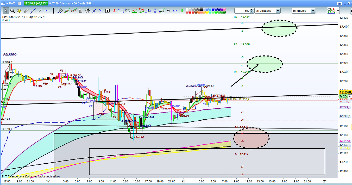 Para finalizar este extenso análisis, en el gráfico de 15 minutos del dax sólo marcar las zonas objetivo probables de la sesión, y recordar que es lunes, y que la prudencia dice que los lunes mejor esperar para la toma de decisiones de trading a las 9,40 o 10 h. Mientras, territorio scalper, buscando trades de pocos puntos y rápidos, porqué después de la pre apertura de las 8h sigue generando velas de indecisión total cambiando de ciclo constantemente y en estas condiciones lo más fácil es perder. Muchísima suerte y muy buenos trades.