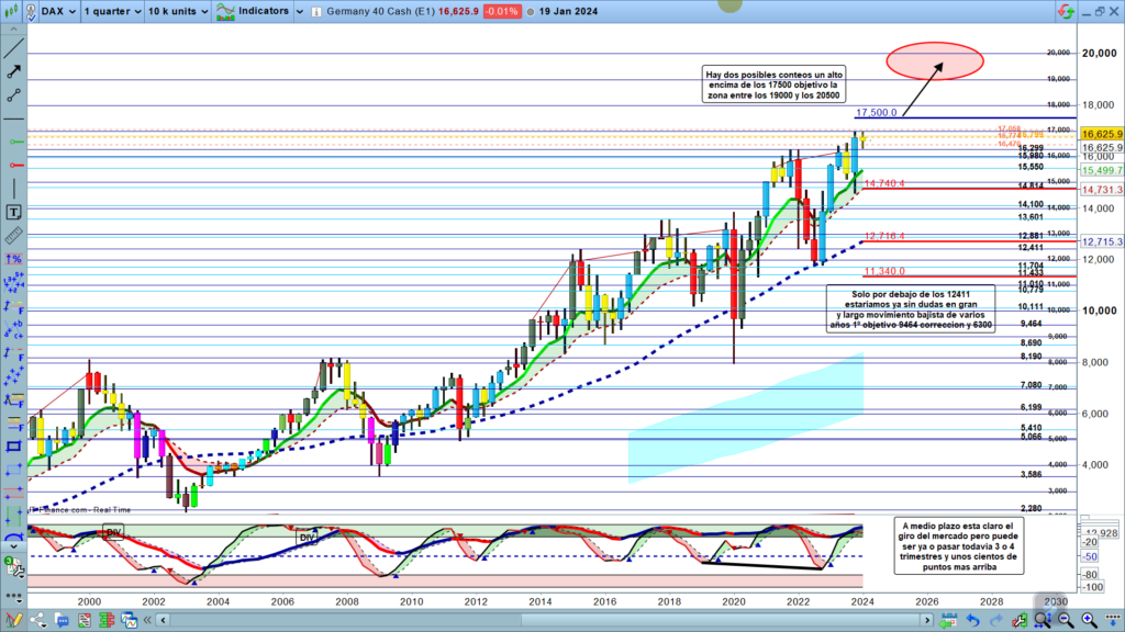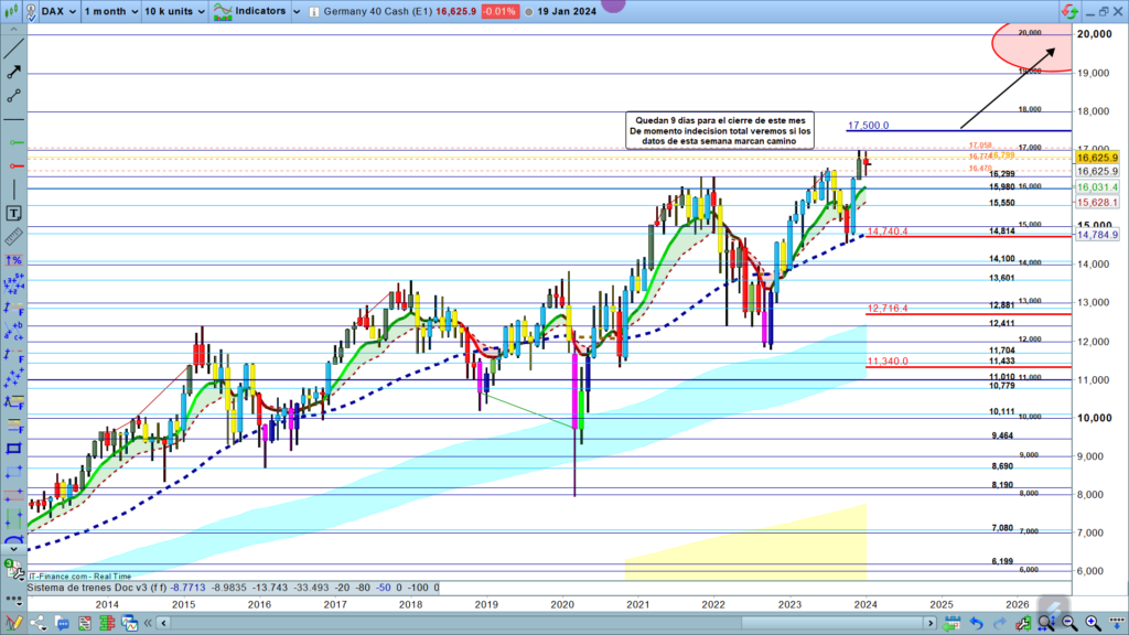 La posibilidad del movimiento bajista, sigue siendo y con mucha diferencia el más probable, pero como siempre antes de poder operarlo debemos de tener una validación y esta no la podremos tener hasta la zona de los 16500. En caso de tenerla el primer objetivo, aparte de los patrones de cinta, la cota histórica muy importante de los, 16299.
