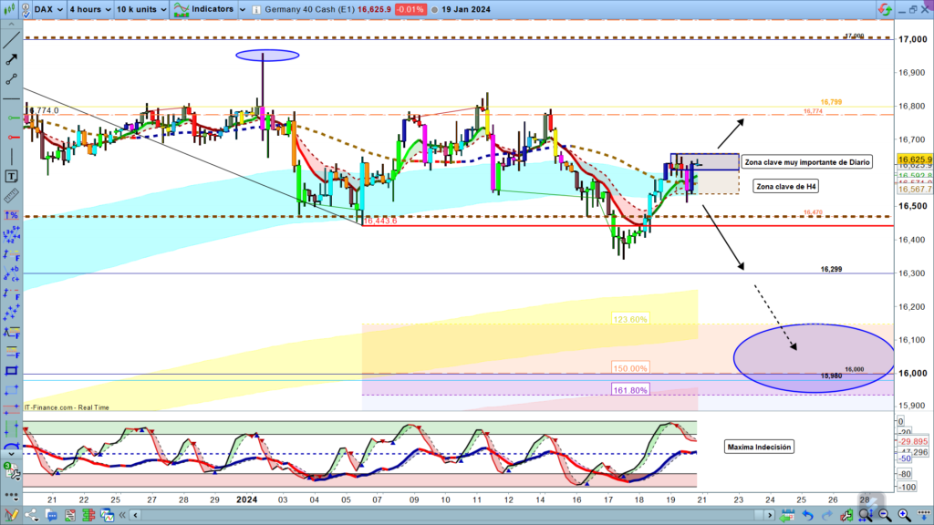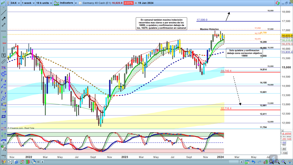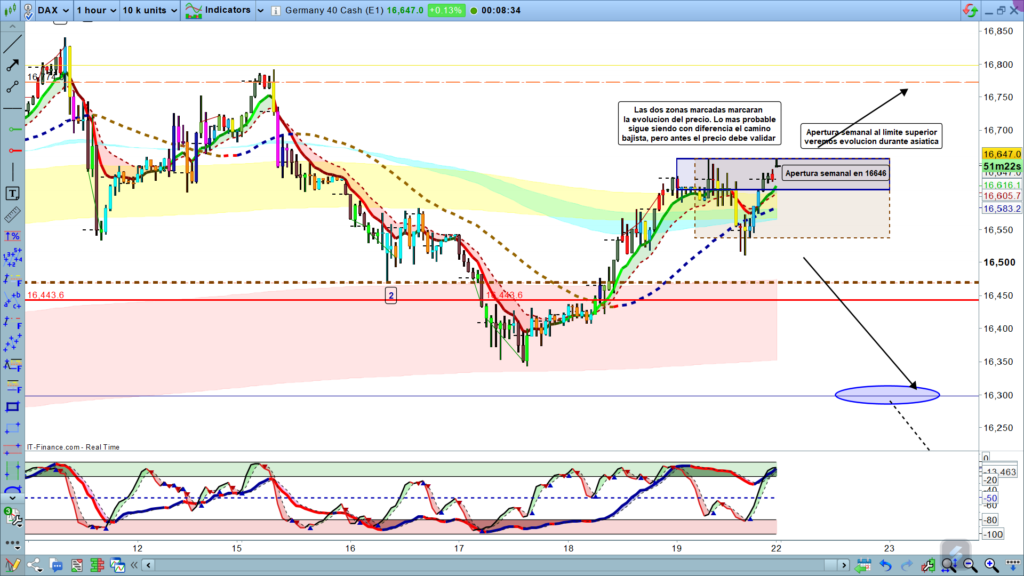 Solo con claro quiebre y confirmación de quiebre por encima de los 16650, pese a la estructura más probable, y todo lo demás, obviamente estaríamos en movimiento alcista con primer objetivo la zona de los 16774 y los 16799, y en caso de quiebre de este último, ya ninguna duda de rally alcista a nuevo máximo histórico. Muchísima suerte y muy buenos trades.