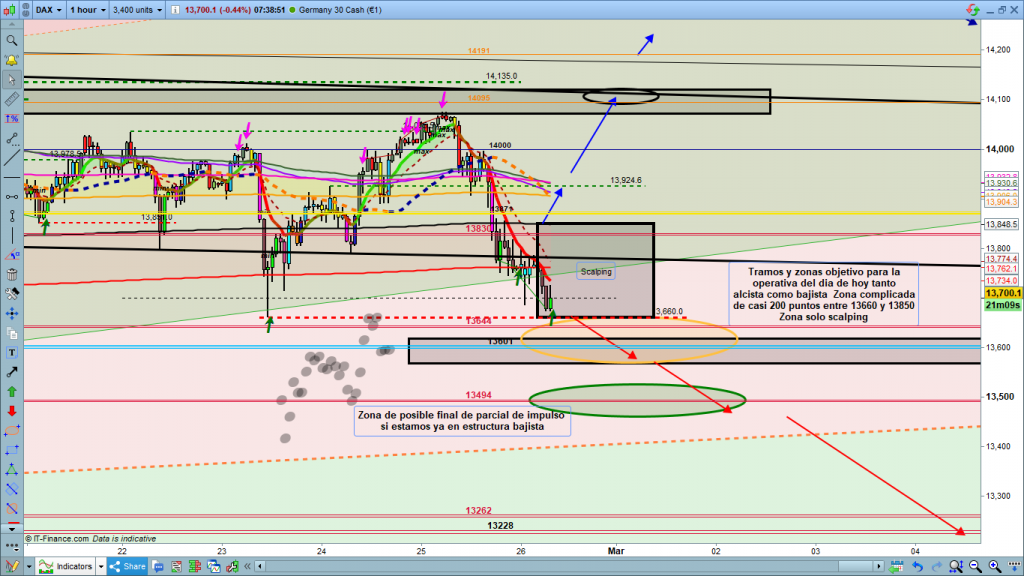En gráfico de 4 horas del dax30, visión muy clara de la estructura actual, el pasado viernes la vela de pre apertura a las 8 h marco nuevo mínimo más bajo, por tanto, secuencia bajista y ahora en corrección. Lo más probable y esperado es que la zona comentada entre 13871 a 13920, o 13925, afinando un poco más, debería ser zona de posible final de corrección y seguimiento de movimiento bajista, con primer objetivo 13601 y zona influencia 13644 por arriba y 13570, por abajo, con posible continuación hasta los 13494, en caso de perder los 13550. Sin embargo es lunes, principio de semana, y por pluma o consolidación en zona 13871, aún podríamos tener algún alto más importante, entiendo como zona máxima por arriba, si es la opción de la apertura del parquet de hoy la zona 14000, como zona máxima a testear, aunque sigo pensando que aparte de posibles movimientos rápidos posibles a las 8 h o a las 9 h, lo más probable o al menos esperado por mí es el movimiento bajista. Entradas en trade siempre después de claras validaciones y estando cotización dax por debajo de zona de corrección. Mucha atención a posible perdida cota histórica 13830, si llega el precio hasta ella.