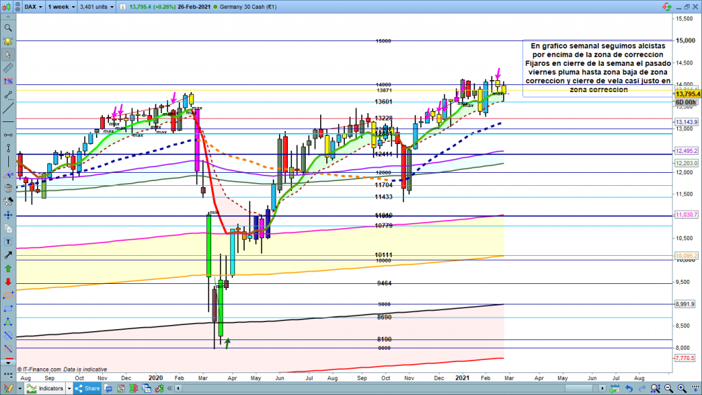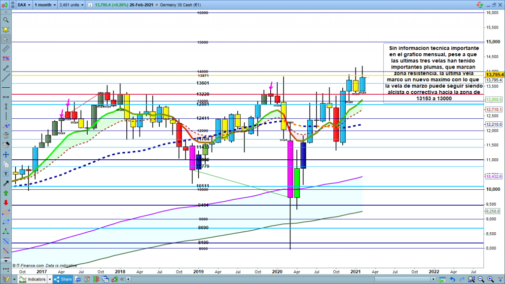No hay parte formativa, volvemos para tenerlo presente, a los gráficos grandes después de los cierres mensuales, semanales y diarios. Si alguien quiere repasar lo que decíamos el pasado viernes con el estudio de los gráficos semanal, diario y menores aquí en el link Análisis Diario Dax 26 febrero 2021.