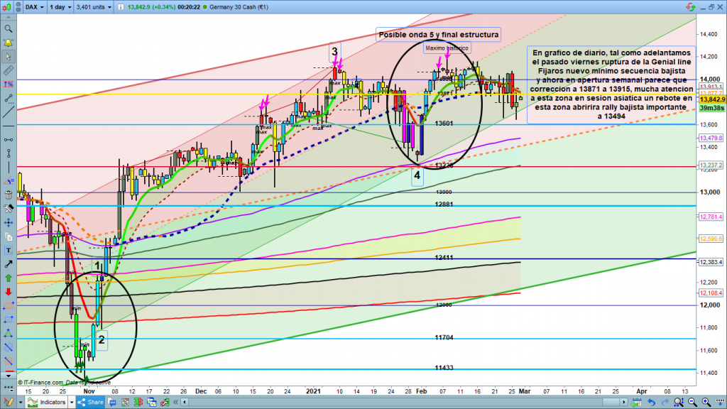 Al ser viernes, final de semana, final de mes, era probable movimiento mantenido cerca de apertura anual en 13871, o incluso posible rally un poco más arriba, pero sin validar nuevos máximos después de tantos detalles y validaciones y confirmaciones bajistas, al final pareció que los inversores intentaron un cierre de mes aun manteniendo posiciones en la zona comentada cerca de 13871, para posteriormente caída a la zona baja de los 13800, siempre dentro de la zona de rectángulo marcada, si os fijáis ni un solo cierre de vela por encima de la zona marcada. En cambio la vela de las 8 h en pre apertura del día, nos marcó cambio de secuencia a bajista y después el resto del día se estuvo moviendo consolidando la cota histórica y apertura anual del 2021. Aquí los dos gráficos, el del análisis del viernes y el de lo ocurrido al final de la semana.