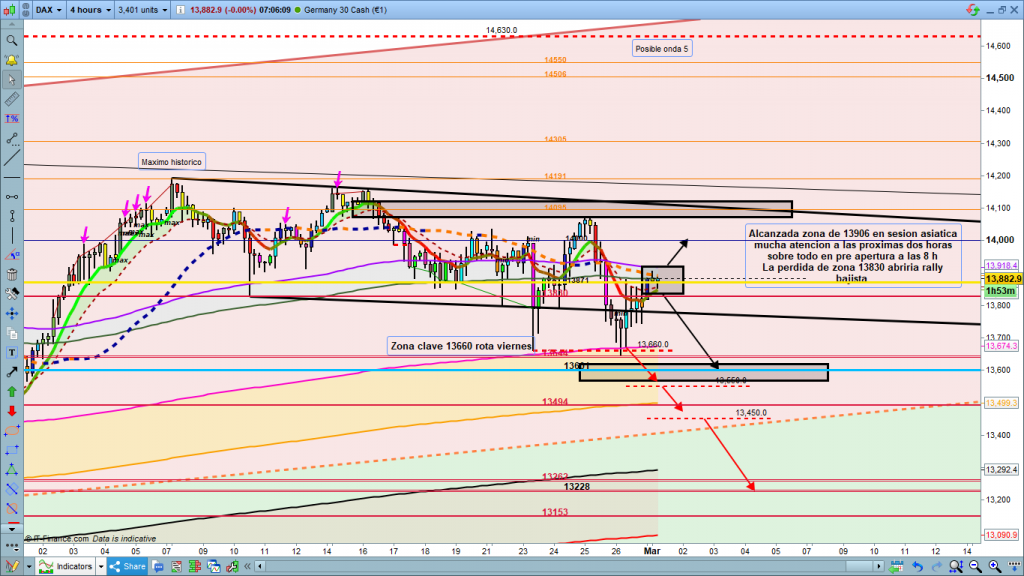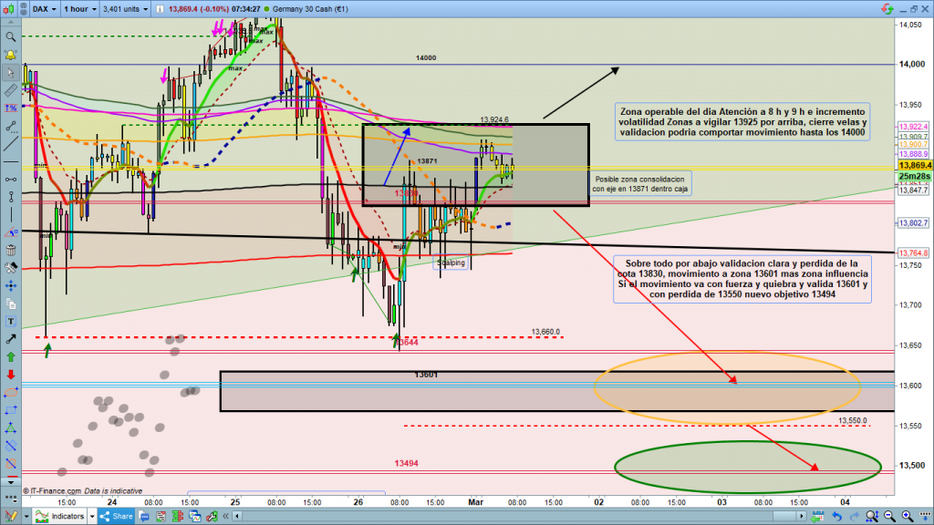 En gráfico de 1 hora del dax30, como cada día Zoom a la zona operable del día, y detalles importantes a tener en cuenta. De momento en estas horas anteriores a la pre apertura, la cotización dax se está moviendo en torno a la cota histórica, apertura anual del 13871, atención a esta zona, ya que la consolidación en torno a ella podría durar horas. Por la parte superior, zona a vigilar los 13925, si los supera y válida en gráficos pequeños o en apertura parquet de las 9 h podríamos testear la zona de los 14000, sin embargo, lo más probable después de los vaivenes de apertura, es que coja el camino bajista, la perdida de 13830, con confirmación, nos daría movimiento esperado hasta 13601, a 13570. y posible consolidación en esta zona entre los 13644 y los 13570, con eje en los 13601, cota histórica importante el resto del día. Solo la entrada de fuerza y la perdida de los 13550, nos llevaría hasta el próximo objetivo en 13494. Y en caso de lunes «negro», no se le espera, la perdida de los 13494, sobre todo con perdida de los 13450, nos llevaría muy abajo a la zona del 13262 a 13228. Esto comportaría nuevo mínimo muy importante. Muchísima suerte, y muy buenos trades. Muchas gracias por el esfuerzo de muchos en los anuncios el pasado viernes, por muy poco no alcanzamos el coste de mantenimiento mensual del blog.