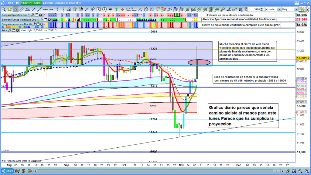 Ayer decíamos que el gráfico diario nos daba muchas señales alcistas, y que al menos el lunes se esperaba alcista, hasta cierre de ciclo. Y marcábamos el posible objetivo a alcanzar en la zona de los 12881 a 13000.