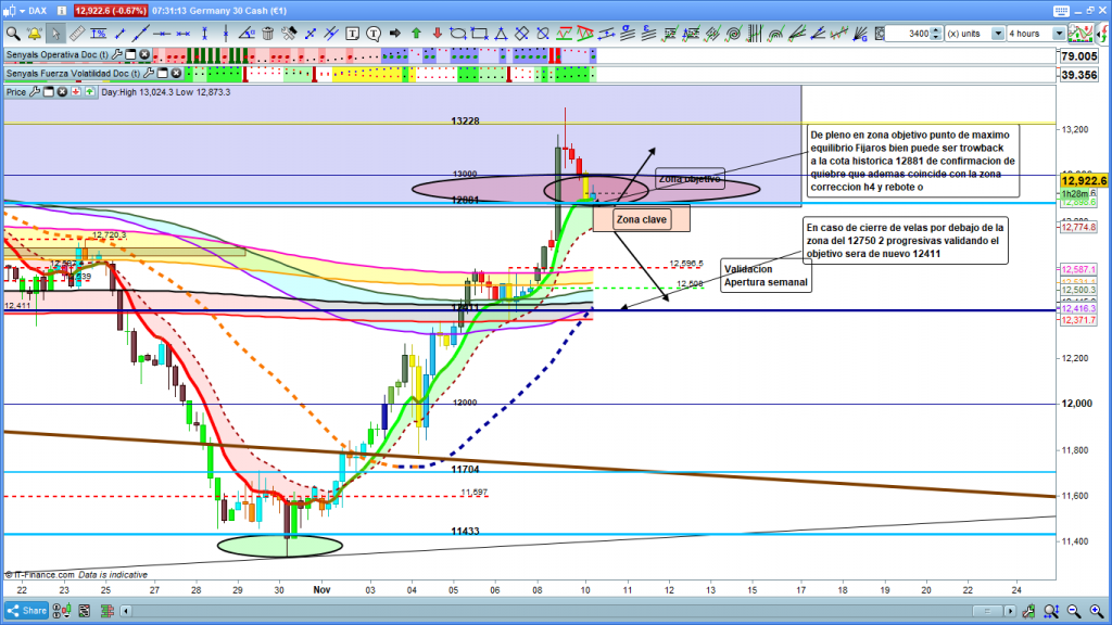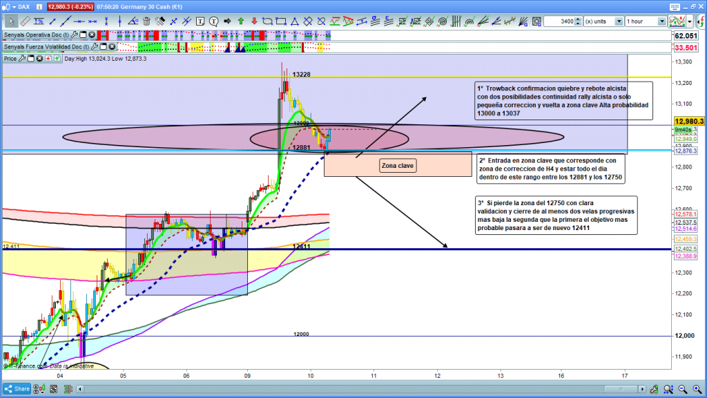 En el gráfico de 4 horas del dax30, visión muy clara de la situación y posible evolución para el día de hoy. De entrada estamos en ciclo alcista en esta temporalidad, justo en la parte superior de la zona de corrección, que coincide con la cota histórica importante del 12881. Pueden pasar básicamente tres posibles movimientos. 1º Rebote en zona actual y movimiento alcista, más o menos hasta la zona del 13000 a 13037, con bastante probabilidad, y a partir de aquí lo que explicábamos antes, de continuidad o caída de nuevo. 2º posibilidad que entre y se quede en la zona clave, que coincide con la zona de corrección, consolidando en este rango con margen de puntos entre los 12881 y los 12750. 3º posibilidad que pierda esta zona, mucha atención, con Validaciones, cierres de velas de gráficos de H4 o mínimo de H1 progresivas, con nuevos mínimos, con lo cual el objetivo sería 12411.