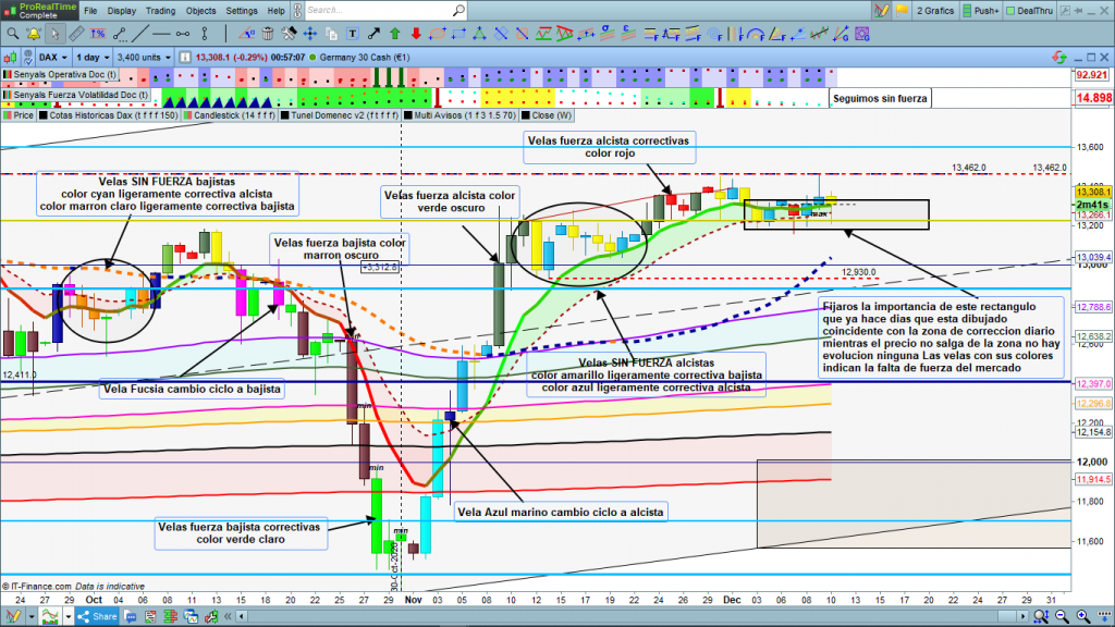 Antes que nada, si hay traders nuevos en el web, para entender mejor los conceptos que explico cada día en los análisis, sería muy importante que por lo menos hicierais un visionado a los videos de los indicadores doc. De esta forma seguro que entenderíais mucho más rápido los conceptos fuerza, falta de ella, volatilidad, velas con fuerza de impulso, velas correctivas, zonas de corrección etc. etc. Sobre todo los indicadores: Control total doc v5 y Túnel Domènec. el primero es el lenguaje del precio con los colores de las velas, el segundo es la base de los movimientos del precio, dentro de su coreografía, impulso, corrección. ya que nos permite conocer siempre las zonas de corrección de los diferentes ciclos de las ondas, y por tanto las zonas objetivo y las zonas de posible cambio de dirección.