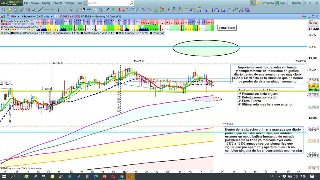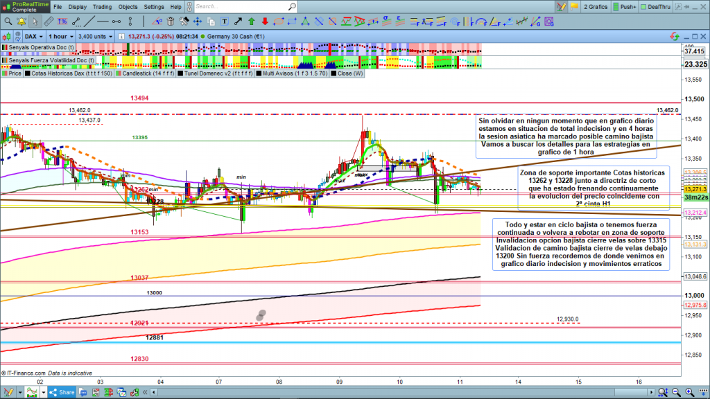 En el gráfico de 1 hora del dax30, detalles y zoom de la zona operable para entender los conceptos explicados. Estamos en zona de soporte importante cotas históricas 13262 y 13228 cota y apertura anual, directriz de corto plazo, (línea marrón) que lleva ya muchos días actuando, frenando evolución de los movimientos bajistas, y coincidente con 2ª cinta de H1, Todo lo explicado sin fuerza no va a poder con el soporte, para scalpers, los pequeños recorridos entre cotas, pueden ser muy rentables, entre 13262 si la pierde y hasta 13228, y en caso de cierre de velas por encima de 13315, posibles scalpings alcistas buscando las zonas de resistencia superiores, 13378 a 13395, superada esta última nuevo ataque a 13462, para intradias esperar quiebre de zona con validación o confirmación con cierre de velas u otro día inoperable. Espero que la lectura pausada de este análisis, os aporte cosas positivas y entendáis un poco más como y porque se mueven los mercados. Muchísima suerte, muy buenos trades y muy buen fin de semana
