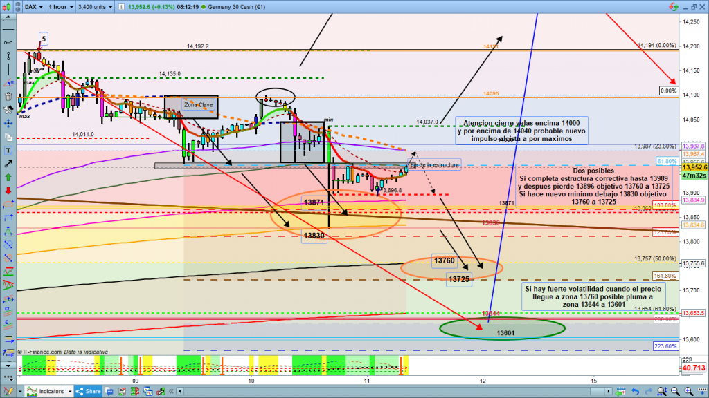 Al final subió hasta la zona esperada de 13895 a 14000, y la supero, cerrando velas consecutivas por encima de 14000, durante la mañana de ayer. y chocando una y otra vez en la zona del 14040, durante el resto del día, hasta pasadas las 00 h, más de 10 horas sin conseguir cerrar ni una sola vela por encima de 14040. La verdad es que estamos en zona límite, para considerar la estructura como alcista o bajista para el día de hoy. Por un lado podría parecer que superados los 14000, deberíamos considerar como más probable el camino alcista, sin embargo, si hacemos el conteo menor ahora deberíamos estar en una onda 3-3 de 1 alcista, y es obvio que las velas del día para nada se parecen a la parte más fuerte de un impulso, por pequeña que sea la fuerza o la volatilidad. Esto hace que por prudencia, eleve la zona de validación de movimiento alcista hasta los 14100. Mientras deberemos estar a la espera de los próximos dibujos del precio, para ver si seguimos en lateral o tenemos cambio de secuencia de máximos/mínimos y por tanto definimos con claridad una tendencia. Ayer decía y proyectaba el siguiente escenario:
