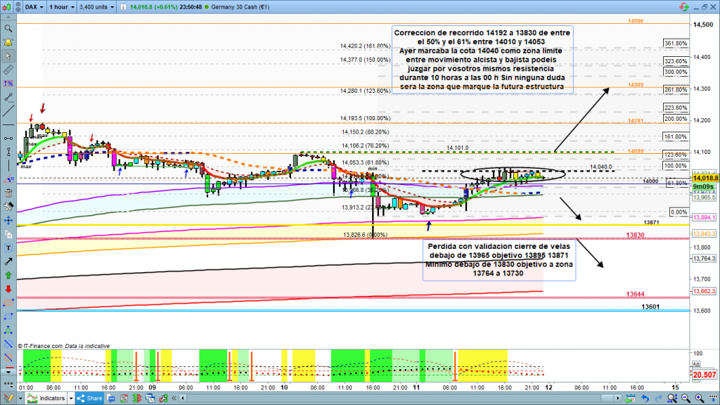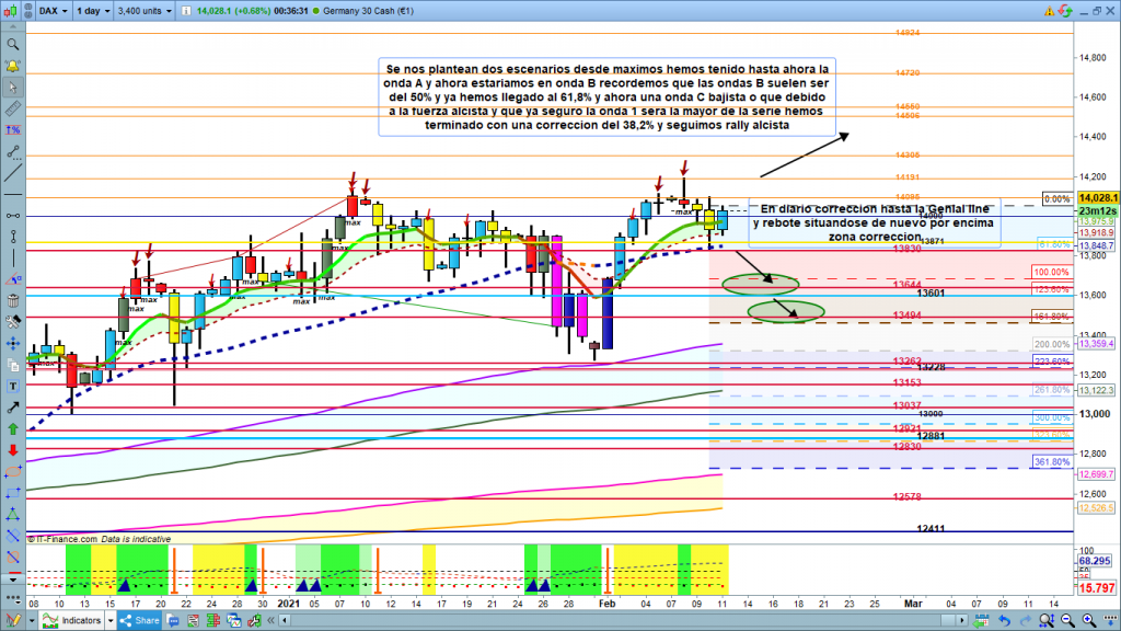 En gráfico diario del dax30, detalle importante, corrección desde máximos, supero la zona de corrección y actuó de fuerte soporte la Genial Line, coincidiendo exactamente con la cota histórica del 13830. Rebote en la zona esperada, pero rebote importante situándose de nuevo por encima de la zona de corrección. Si solo hubiéramos tenido pluma por encima de 13950, la opción que me parecía más lógica en el análisis de ayer, pluma hasta 13985 a 14000, y vuelta abajo para cerrar por debajo de 13950, la opción bajista seria sin duda la más clara, sin embargo ahora con cierre por encima de la zona de corrección después de haber completado corrección mínima, abre muchas posibilidades de seguir rally alcista, la solución en la zona entre 14040 y 14100, por encima de 14100, difícilmente hablaríamos de una corrección de onda B superior al 80%. y situándose de nuevo por debajo de la zona de corrección, o sea por debajo de 13900 a 13830, la posibilidad de onda C con los diferentes fibonacci y zonas marcadas en el mapa serian las más probables. Resumiendo atención a zonas 14040 a 14100 por arriba y 13900 a 13830 por abajo, dos zonas de apenas 60 o 70 puntos que marcaran la estructura operable.