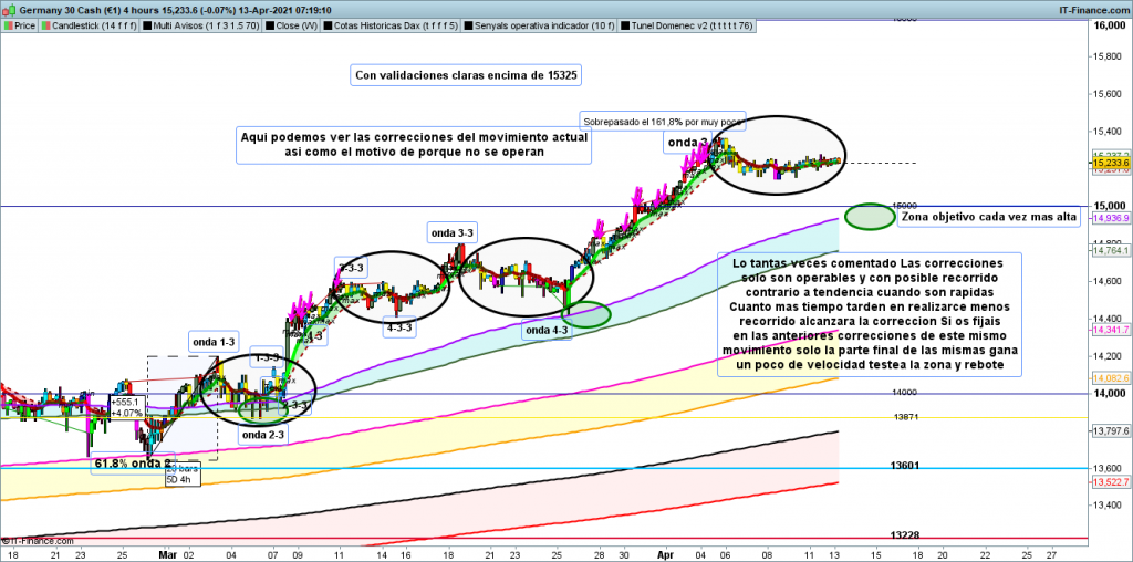 Teniendo en cuenta que ya alcanzo hace días la zona de corrección del 23,6% en la zona del 15146, si ahora el precio, si situara claramente por encima de los 15325, con claras validaciones y cierres de velas importantes por encima, posiblemente se aceleraría el movimiento dando paso a un nuevo impulso en busca de nuevos máximos históricos. Un día más un importante rango inoperable, solo apto para scalpers expertos, pero solo tenéis que ver los gráficos de 4 y 1 horas, movimientos erráticos en ambas direcciones, todo y seguir manteniendo de momento la secuencia alcista. No es zona para operativa de Intradia, mucho menos intersemanal. Solo scalpers y en gráficos muy pequeños. Muchísima suerte y muy buenos trades.