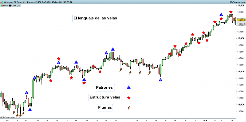 Explicaba en el área formativa anterior, que toda la información que debemos conocer del mercado lo tenemos en las velas de cualquier gráfico. Hoy solo una pequeña introducción que iré ampliando. Mientras tengamos una secuencia de velas donde cada vela hace un nuevo máximo más alto, en sentido alcista, o un mínimo más bajo en sentido bajista, significa que estamos en tendencia. Y las tendencias se suelen formar con series de velas bastante numerosas, independientemente de las pequeñas correcciones. Básicamente hay dos parámetros que paran la evolución de una tendencia, los patrones (que ya veremos con detalle) y las estructuras de las propias velas. O sea cuando en una serie de velas alcistas, donde cada una es más alta que la anterior, aparece un patrón de cambio, o la siguiente vela no realiza un nuevo máximo (estructura de velas), suele ser el momento de salir del trade, porque a partir de aquel momento empieza una corrección, que sin amplios estudios no podemos saber si será menor o mayor. Por otro lado y para acabar esta pequeña introducción, la aparición de varias velas más o menos consecutivas, con plumas en la dirección del movimiento, plumas importantes dentro del cuerpo de la vela, por arriba en caso de movimiento alcista, y por abajo en caso de movimiento bajista, son una clara señal de atención, de falta de fuerza y posible evolución e inicio de corrección mayor o cambio de tendencia. Cuanto más fuerza hay en un movimiento el seguimiento se hace con la estructura de las velas, ya que con fuerza es difícil que aparezcan patrones solo en los grandes finales de movimiento, cuando la fuerza ya ha ido desapareciendo.