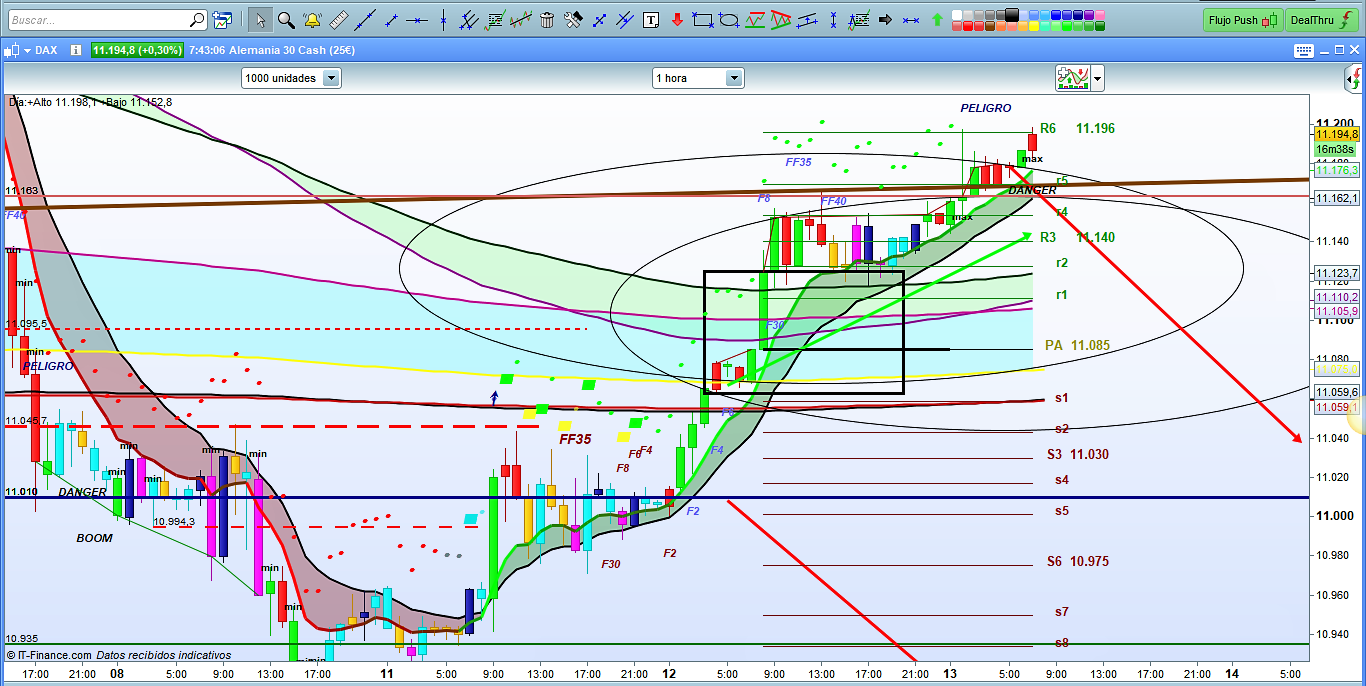 Podemos ver todo el rally propuesto: desde 10935 hasta la zona 11163-11200, más de 200 puntos de momento. A partir de este punto lo más razonable es esperar. Estamos ya en la cola del movimiento y cabeza del siguiente. Por tanto, zona inoperable. Es muy importante no anticiparse en la entrada en dirección contraria del movimiento en curso, ya que éste, dependiendo de la volatilidad del momento, podría seguir unos puntos más con alta volatilidad y sacarnos con el Stop Loss. De ahí la frase tan repetida de «esperar validaciones y confirmaciones», que son muchas y diferentes. En un próximo video las intentare explicar casi todas.