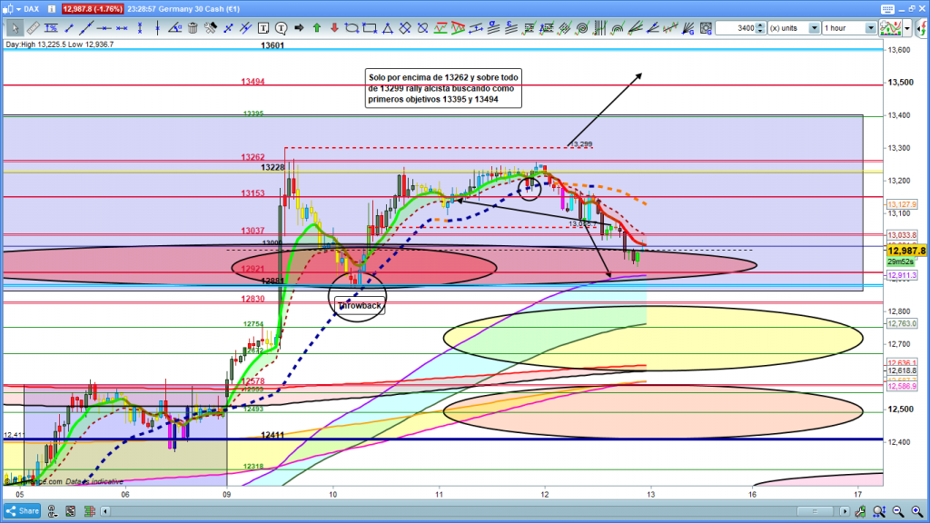 En el gráfico de 1 hora del dax30, detalle más ajustado para la operativa más inmediata. La zona clave los 13000, si los pierde, y entra fuerza rally bajista hacia objetivos, primero 12921 y 12881, y dependiendo de fuerza y que patrón haga en 12881, podría bajar un poco más o quedarse consolidando en la zona. Mientras se mantenga por arriba puede seguir en lateral o movimientos erráticos, mucho cuidado a la zona de 13060, podríamos tener una pluma hasta allí y justo a partir de este punto empezar rally bajista de nuevo. Solo validando por encima de esta zona de cota 13037 a 13060, posibles recorridos alcistas hacia 13153, de entrada. Muchísima suerte y muy buenos trades, y pasad un muy buen fin de semana.