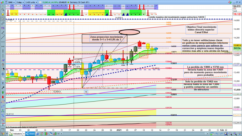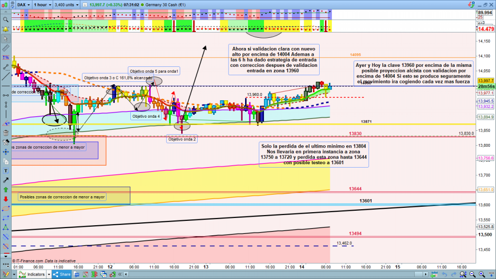 Visión del gráfico de 1 hora de las 00 h CET, atacando la zona de posible validación primera en 13960, Recordemos que para validación definitiva 14004 un nuevo alto sobre la cota de último máximo, para tener ya la estructura con proyección a la zona 14160 a 14191, con posible extensión a zona 14250, como onda 3 de la estructura en curso.
