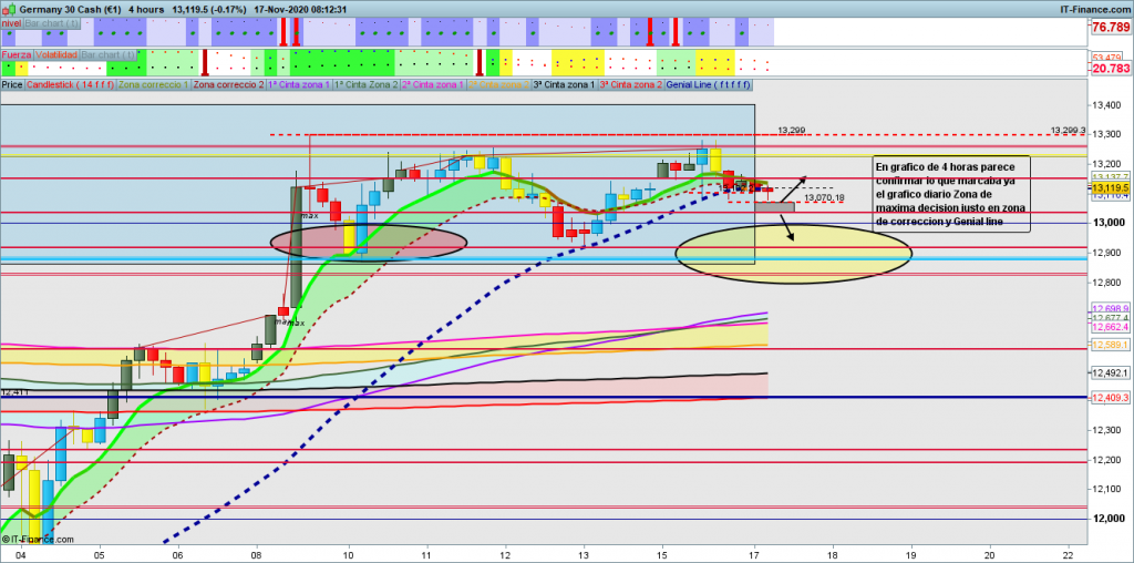 En gráfico de 4 horas del dax30, podemos ver perfectamente la zona clave del día, la cotización dax está en estos momentos en zona de máxima indecisión, justo un poco por debajo la misma zona que ayer ya nos marcaba la zona de posible cambio, perdiendo la zona 13070 a 13037, entraríamos en zona de cortos donde en la zona de los 13000 tendríamos un posible testeo y rebote, solo en caso de marcar un nuevo mínimo por debajo de 12930, se nos plantearía estructura bajista más importante con objetivos en la zona de los 12685 a 12650. Si la cotización dax, rebota en esta zona clave 13070 a 13037, o tenemos un rebote claro en 13000, situándose de nuevo encima de zona clave entonces ataque a 13153 y muy posiblemente a 13228 ya con muchas más garantías de quiebre y continuidad alcista, buscando de nuevo 13262,13298, y proyeccion a 13395 y 13462 zona clave a largo plazo.