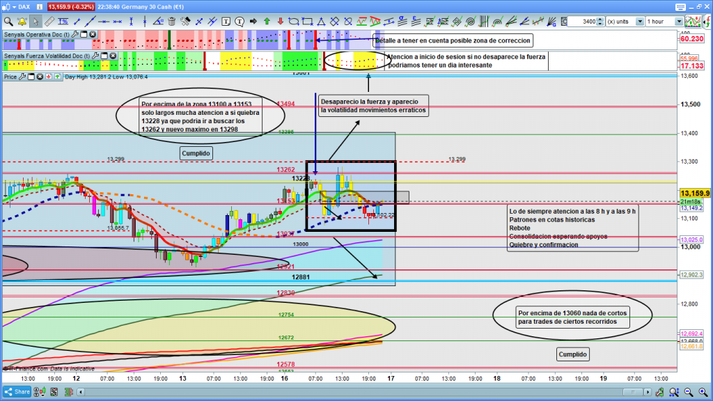 En el gráfico las diferentes claves de lo ocurrido, la corrección anunciada ya en el análisis de ayer se cumplió, generando el testeo hasta los 13070 a 13100, y rebote, vuelta a 13228, quiebre y confirmación en gráficos más pequeños, y testeo a 13262, con pluma hasta 13281, y cierre por debajo de cota histórica 13262, patrón de rebote y de nuevo a la zona 13070 a 13100. Nuevo rebote en la zona y a consolidar para finalizar el día en la cota 13153, fijaros la importancia de las diferentes cotas históricas de la zona 13262, 13228, 13153. Si miramos el oscilador de fuerza-volatilidad, vemos perfectamente la explicación de lo acaecido durante el día, nada de fuerza, y diferentes tramos de volatilidad durante el día, generando los movimientos erráticos en ambas direcciones. Para mi día inoperable, para los scalpers, entiendo que es un buen día para ver la importancia de las cotas, para la toma con cierta seguridad de beneficios por cierre de trades en dichas cotas históricas.