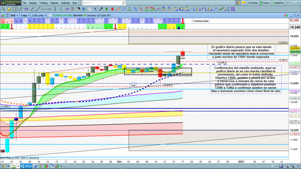 En gráfico diario del dax30, es donde se ve con claridad el movimiento que hacia días que explicaba, que si teníamos quiebre de 13462, aceleración del movimiento, ataque a 13601, quiebre, en H1 incluso ha confirmado con Throwback, e impulso que acabaría con pluma, personalmente pensaba que a la zona 13655 a 13666, y ha sido hasta 13690 con pluma a 13730. A partir de aquí ha empezado una corrección, no sé si la corrección de diario, o todavía lateral de corrección menor, y nuevo máximo antes de la corrección a zona 13500 a 13462, para confirmación de quiebre de zona tan importante. Y cuando finalice esta corrección de diario que puede durar días y semanas, dependiendo de lo que ocurra en el cierre del presente y especial ejercicio de récords del 2020, de nuevo impulso alcista. Objetivo amplia zona entre 13830 y 14630, lo tendremos que ir estudiando a medida que vaya trazando y dibujando estructuras, ya que al ser diagonal final, la estructura de toda la onda 5, con onda 3, de menos recorrido que onda 1, podría ser que el último movimiento, el que esta ahora en curso tuviera también una doble estructura de diagonal final, con lo que deberemos tener mucha precaución y estar muy atentos a las estructuras menores cuando sea el momento.