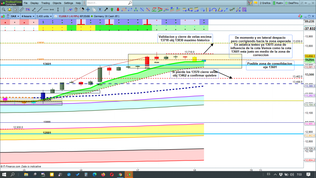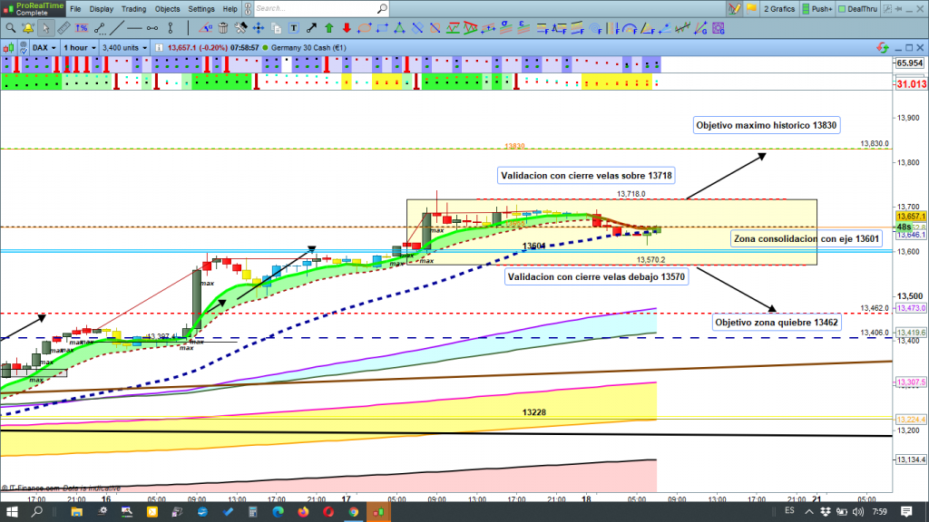 En gráfico de 4 horas del dax30, después de la pluma esperada, lateral hasta la zona de corrección de H4 y zona influencia cota 13601, Validaciones con cierres de velas por encima de 13718, objetivo los 13830, en lo que sería un primer ataque, que siempre suele producir rechazos a máximos históricos del Dax. Es posible que siga lateralizando dentro de la zona de consolidación marcada entre los 13715 y los 13570 con el eje la cota histórica del 13601. En caso de validación de perdida de los 13570, siempre con cierre de velas progresivas, el objetivo sería 13500 a 13462, para confirmación de quiebre de zona tan importante y peleada las últimas semanas.