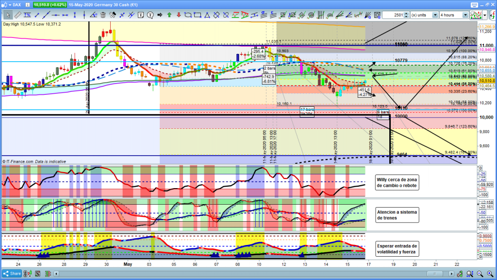 Técnicamente, hemos tenido volatilidad y fuerza durante el rally de bajada, desde 11035 hasta 10160, y justo en el cambio de tendencia tanto la volatilidad como la fuerza desaparecieron, también se puede apreciar por el cambio de color de las velas a azul claro. Ahora willy esta a punto de llegar a zona de cambio de tendencia o final de corrección, por tanto durante la sesión asiática del lunes, creo que tendremos la información más clara sobre la posible evolución de la cotización dax. Siendo especialmente importante el cierre de la vela de 4 horas de las 9 de la mañana coincidiendo con la apertura de Frankfurt.
