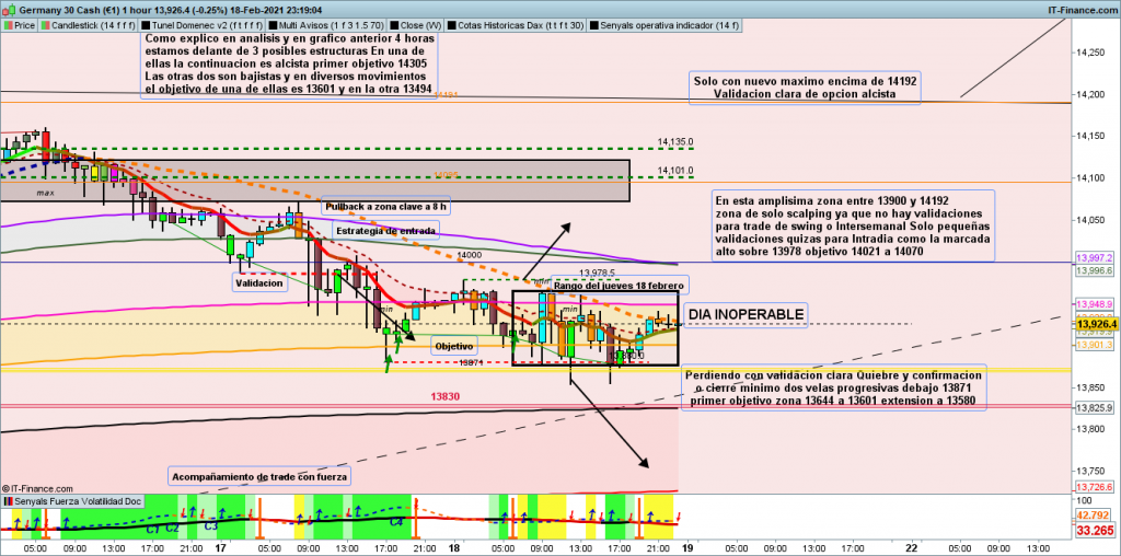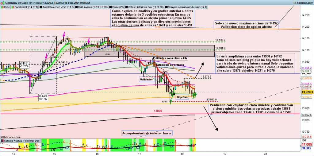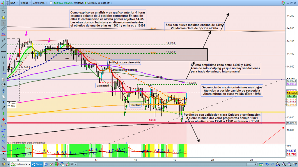 En gráfico de 1 hora del dax30, situación muy parecida a la de ayer, solo que la proyección de posible validación en 13978 ha cambiado, veníamos de una figura de no nuevo mínimo, que nos proyectaba el movimiento a una zona objetivo determinada, y ayer y hoy en asiática, hemos tenido nuevos mínimos, aunque sin validar perdida de 13871. Justo ahora antes de pre apertura, tenemos cambio de secuencia de máximos/mínimos, abriendo de momento opción alcista, veremos que estructura nos dibuja y hasta donde se va el movimiento, ya que seguimos con los tres posibles abiertos, exactamente igual que ayer. Poco más puedo aportar ver gráfico para tramos operables y zonas de soporte o resistencia, que si el precio llega hasta ellas pueden parar el movimiento. Muchísima suerte y muy buenos trades, y pasad un muy buen fin de semana.