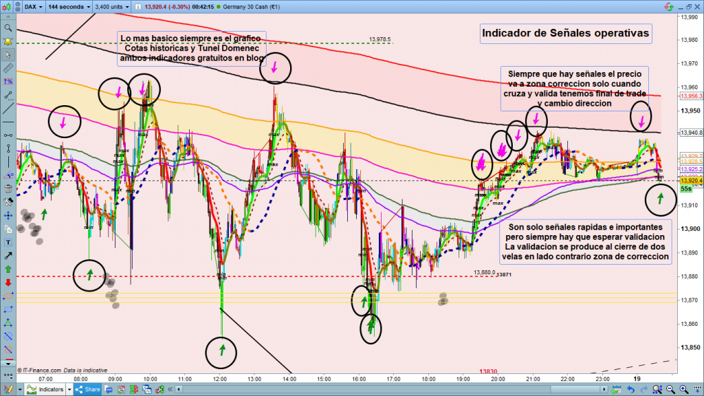 Es un indicador, que en más del 80% de las ocasiones en que marca la señal, es punto de giro del movimiento, y en el 20% restante, cada vez que marca señal, el precio va hasta la zona de corrección, pero no la supera, sino que rebota y sigue la tendencia un poco más, normalmente no mucho, ya que solo aparece cuando el agotamiento del movimiento es muy importante. Sirve para todas las temporalidades, y como todas las señales que dan indicadores u osciladores, para entender lo que está ocurriendo, hay que tener a la vista en el mismo tiempo, gráficos de diferentes temporalidades, Si por ejemplo en H1 y en m12, estamos en movimiento alcista, aprovecharíamos las señales y la validación posterior en gráfico de 144 segundos, para operar en el sentido del movimiento principal. Para scalpers muy expertos, y que operan scalping extremo, estas señales les pueden ser de mucha ayuda para ajustar al máximo las entradas y las salidas del trade. Otro día más, tengo unos cuantos en fase ya muy adelantada, pero sobre todo 3 o 4 que creo que serán muy interesantes y ayudaran mucho.