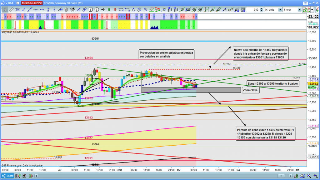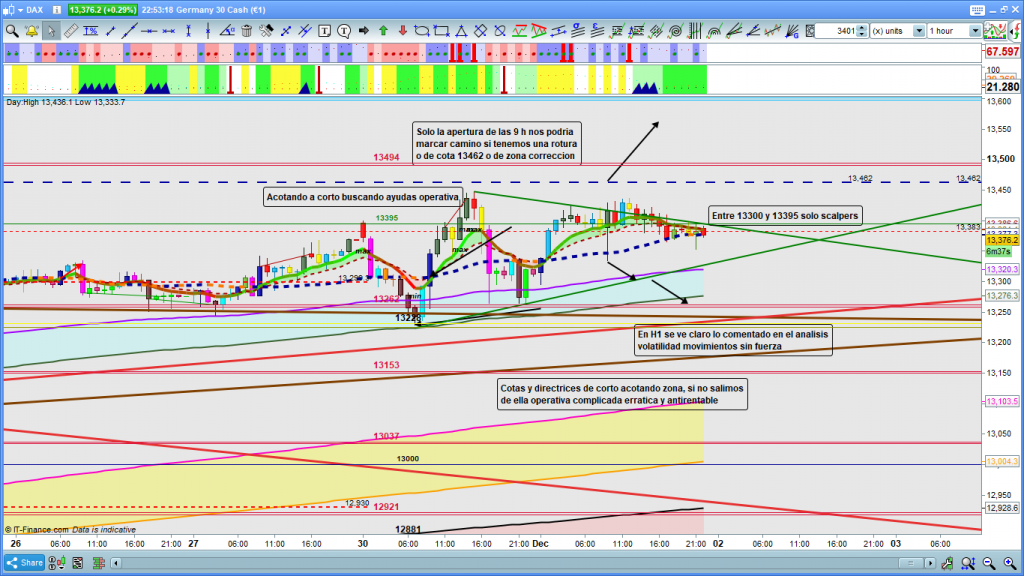 Y además lo explicaba así: «En gráfico de 1 hora del dax30, fiel imagen de todo lo comentado en el análisis, para ayudar en la toma de decisiones he acotado pequeña zona con directrices de corto plazo de posible figura, Si no salimos de la zona, por arriba 13462, y por abajo 13228, no espero recorridos interesantes, es más la zona entre los 13300 y los 13395 estas primeras horas, la considero zona solo para scalpers, con salidas rápidas de los trades sin esperar desplazamientos interesantes.» Y lo que ocurrió durante la jornada de ayer fue lo siguiente: