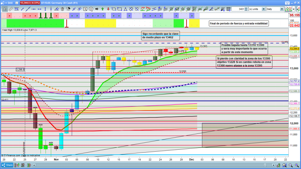 En el gráfico de diario del dax30, Anteayer decíamos final de periodo de fuerza y ayer entrada de volatilidad, si sigue el periodo de volatilidad, el día de hoy, contando desde ya en sesión asiática, la cotización dax, debería bajar hasta 13310 13300, y muy importante lo que ocurra a partir de este testeo. Si tuviéramos un rebote como el pasado viernes, volveríamos de nuevo a la zona del 13395, un quiebre y confirmación sobre esta cota, posiblemente nos daría un segundo ataque a la zona del 13462. En cambio si pierde la zona, el objetivo principal serian los 13228 a 13205. En caso de perdida de esta zona y sobre todo confirmando la perdida con confirmación de 13153, nos daría un interesante trade a cortos buscando la zona de los 13000, 12930, 12881, 12830, 12754, como máximo del movimiento correctivo de este ciclo.