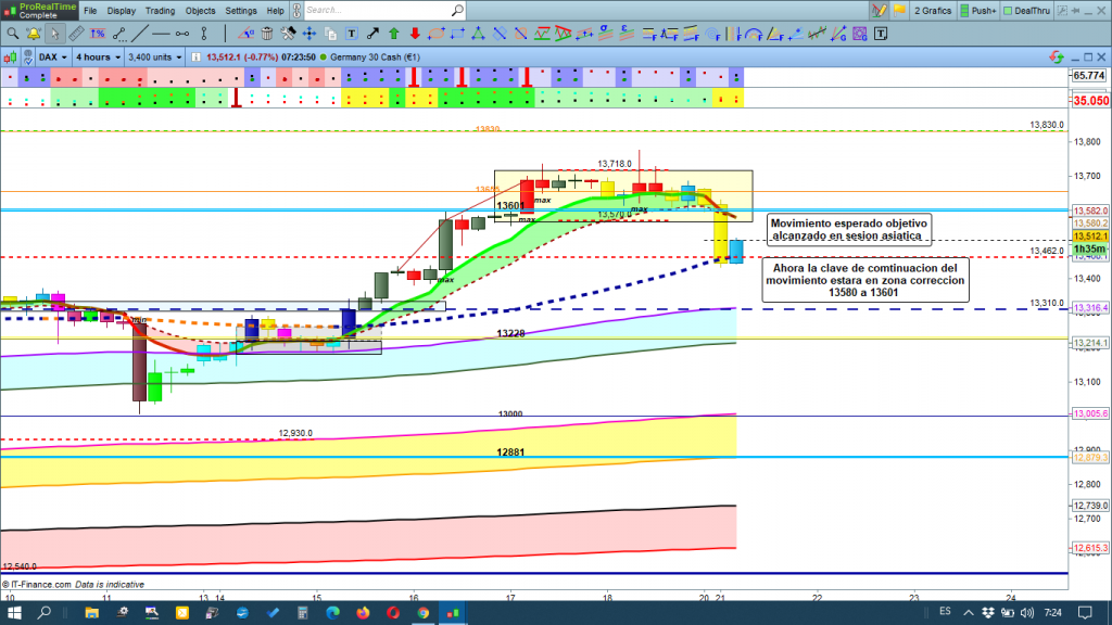En gráfico de 4 horas del dax30, vemos como en sesión asiática, ha realizado ya la corrección esperada, por lo menos hasta el primer objetivo y principal esperado. A partir de aquí la clave del día va a estar en la zona de los 13580 a 13601, mientras se mantenga por la parte inferior, seguimos en zona de corrección pudiendo ir a buscar corrección mayor. Si se sitúa de nuevo por encima de 13601, con confirmación de quiebre, estaremos de nuevo en el mismo escenario que la semana pasada. Podría estar consolidando alrededor de esta cota tan importante varios días, solo el cierre de velas continuas y progresivas por encima de 13718, marcaría camino a nuevo ataque a la zona de máximos históricos en 13830, sería ya por tercera vez, y cada vez quedan menos órdenes de cierre de trades para recogida de beneficios y cada vez están más arriba, fijaros que en los dos anteriores ataques, primero en 13735, y después en 13775, se activaron multitud de estas órdenes de venta generando amplias plumas. Por tanto la operativa de esta estructura hasta 13830, si la corrección de diario ya hubiera finalizado con la confirmación de quiebre de 13462, va a ser complicada, en el corto plazo con movimientos de alta volatilidad. Mientras se mantenga por debajo de 13601, y sobre todo con nuevo mínimo más bajo de 13435, objetivo esperado la zona ya comentada en gráfico diario de 13310, 13262,13228.