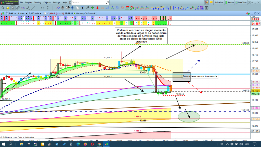El pasado viernes en el análisis decía lo siguiente: «En principio, tenemos una zona de consolidación que va desde 13715 hasta 13570, con la cota histórica importante del 13601, en medio que es la que puede actuar durante horas de imán y tener la cotización dax en su área de influencia. Si rompe con validación esta zona de consolidación, con cierres de velas progresivos por encima de 13718, objetivo zona de máximos históricos en 13830, aunque en primeros ataques se podrían producir rechazos debido al vértigo de los inversores y al cierre masivo de órdenes por la toma de beneficios. Por la parte inferior la perdida con validación de cierres de velas de los 13570, nos daría un rally a zona objetivo de 13500 a 13462, a confirmar él quiebre de esta zona tan importante y luchada durante las últimas semanas. y esto lo explicaba en el gráfico de 1 hora, veamos lo que paso, con las zonas marcadas anteriormente en dicho gráfico.», y en el párrafo anterior decía: «si teníamos quiebre de 13462, aceleración del movimiento, ataque a 13601, quiebre, en H1 incluso ha confirmado con Throwback, e impulso que acabaría con pluma, personalmente pensaba que a la zona 13655 a 13666, y ha sido hasta 13690 con pluma a 13730. A partir de aquí ha empezado una corrección, no sé si la corrección de diario, o todavía lateral de corrección menor, y nuevo máximo antes de la corrección a zona 13500 a 13462.»