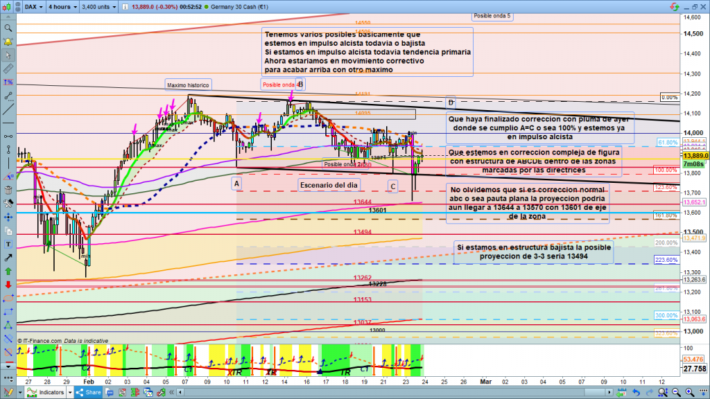 Ayer planteaba en el gráfico de 4 horas diferentes escenarios, explicando cada estructura posible y cuáles serian los puntos de validación o de entrada, así como los posibles objetivos. Trace una posible estructura de figura, y dentro de los posibles movimientos para la operativa del día de ayer, en una de las posibles estructuras bajistas, explicaba que perdiendo 13940 con validación, objetivo claro y muy seguro 13871. Trade para el muy corto plazo prácticamente en apertura como así fue, después ya era un poco más complicado, ya que de las dos posibles bajistas, la validación no la tendríamos hasta perder la directriz inferior, o tras la perdida del 13760. Esta rotura daba un recorrido interesante con primer objetivo la zona 13644 a 13570, con 13601 como eje de la zona objetivo. Esto es lo que explicaba en el día de ayer en el Análisis Diario Dax 23 febrero 2021