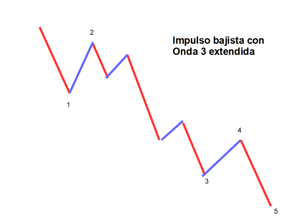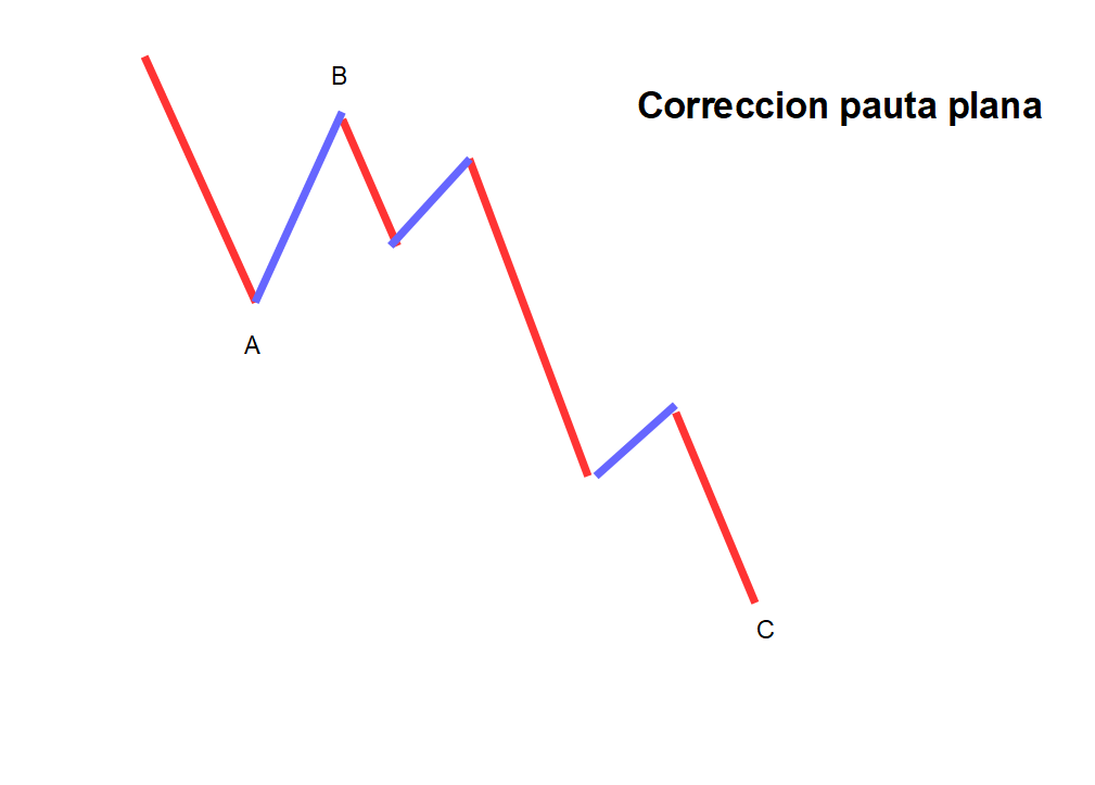 Esta es la estructura tipo de una corrección de pauta plana, normalmente se da en las ondas 2, más del 98% de las ocasiones y en el 40% de las veces en las ondas 4. La estructura que vemos a continuación, es la de un impulso normal bajista, con sus 5 ondas, y en el caso del dax con la característica de onda 3 extendida.