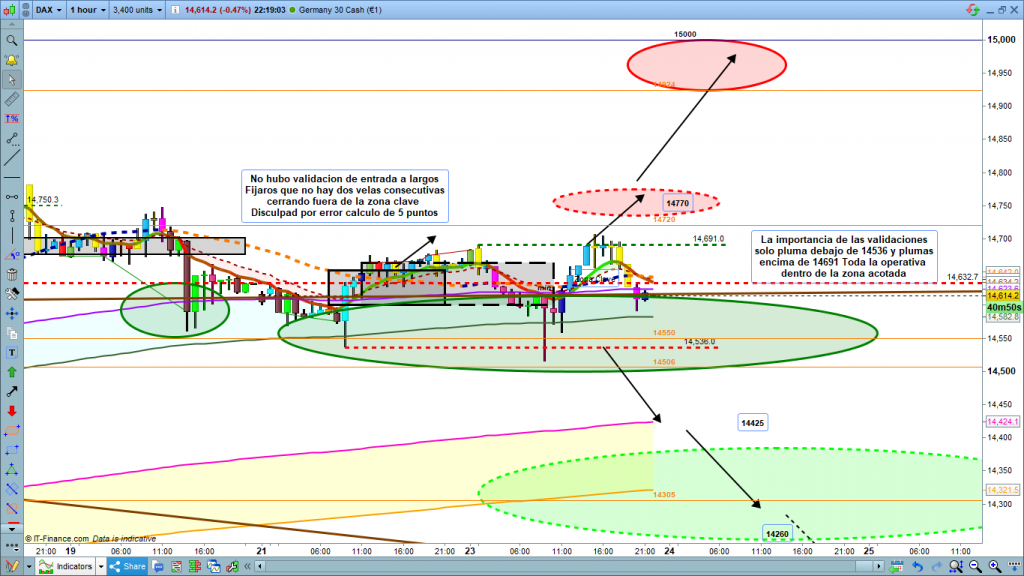 Como podemos ver en el segundo gráfico de los recorridos realizados en el día de ayer, la cotización dax no rompió en ningún momento las cotas marcadas como importantes para el día. Por la parte inferior la zona del 14536, testeada con la pluma de las 9 h. y después al mediodía, varios testeos en la zona marcada del 14691, con pequeñas plumas en varias velas, pero ni un solo cierre por encima, actuando la cota como importante resistencia. Al no poder quebrarla, perdida de impulso, cambio de dirección de nuevo, y vuelta a zona de apertura.