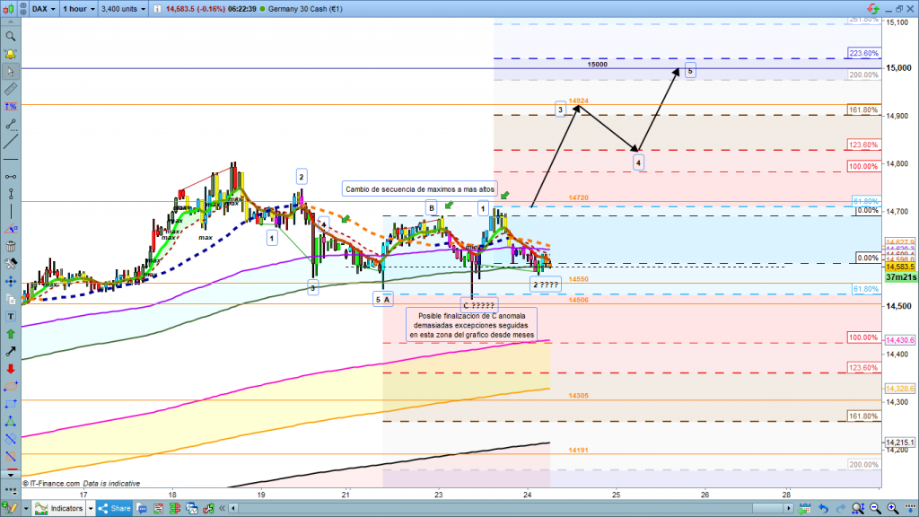 Cuando hablo de estructuras, siempre es para buscar el siguiente movimiento o la siguiente estructura más probable. Aunque a veces las estructuras dibujadas no son de lo más ortodoxas que nos gustaría. En la situación actual, si os fijáis en el gráfico anterior, tenemos una bajada de 5 ondas, que podría ser onda 1 u onda A, hasta la zona del 14537. Luego tenemos un recorrido alcista, superando por poco el máximo anterior, que podría ser por la cantidad corregida una onda B, hasta la zona del 14691. Y un tercer movimiento, que esperábamos como onda C u onda 3 bajista, con diferente objetivos posibles pero todos por debajo de la zona del 14425, y con posibilidades claras de llegar hasta el 14191, zona del 161,8% de la proyección. Sin embargo, movimiento extrañísimo en el día de ayer, fuerte bajada con pluma solo hasta el 14515, muy lejos de la zona mínima esperada en 14425, y rápido rebote alcista. Y ahora lo interesante, el rebote alcista, por poco pero marco nuevo máximo en la estructura, por encima de 14691, más concretamente hasta 14707, dando así un cambio de secuencia de máximos y mínimos de tendencia bajista a alcista. Con todo esto tenemos que la estructura más probable ahora mismo (no la única), es la dibujada en el gráfico anterior. Si tenemos un nuevo alto por encima de 14707, sin antes haber perdido los 14515, las posibilidades de ir a la zona del 14924 aproximado (es cota proyectada matemáticamente, a falta de ajustar cuando tengamos histórico en la zona), serian muy altas, para después posterior corrección y nuevo impulso a la zona de los 15000, para acabar esta sub onda actual. Mucho cuidado no es el único conteo posible, ya que estamos en un movimiento de onda 4, y estas pueden llegar a ser muy complejas, con laterales eternos. Pero si seria, si se cumplen ambas condiciones el movimiento esperado mas probable.