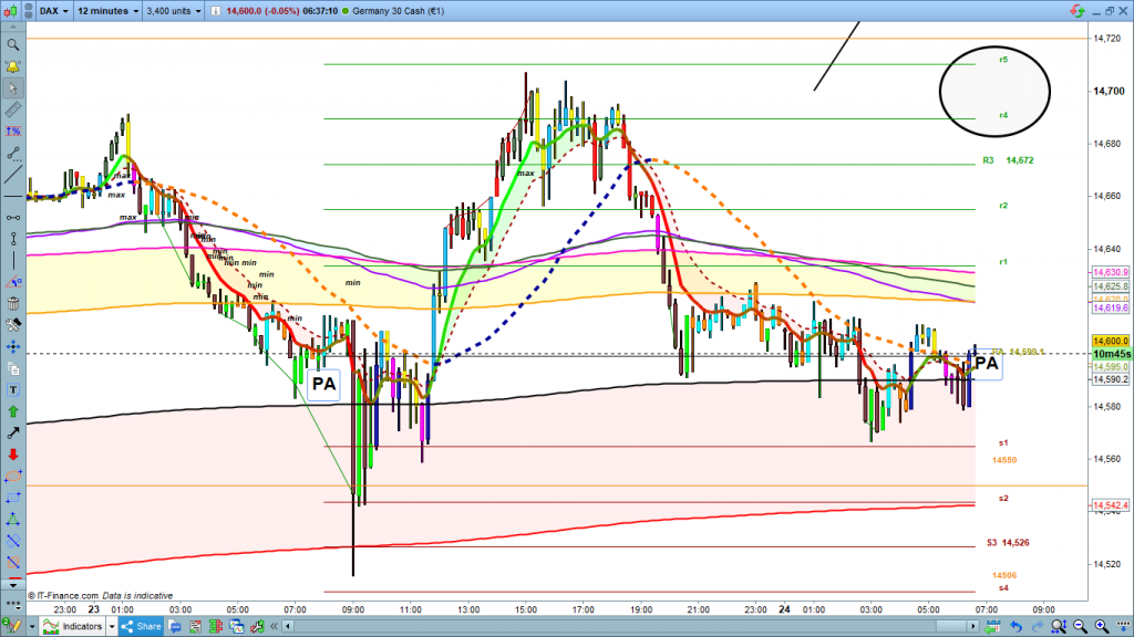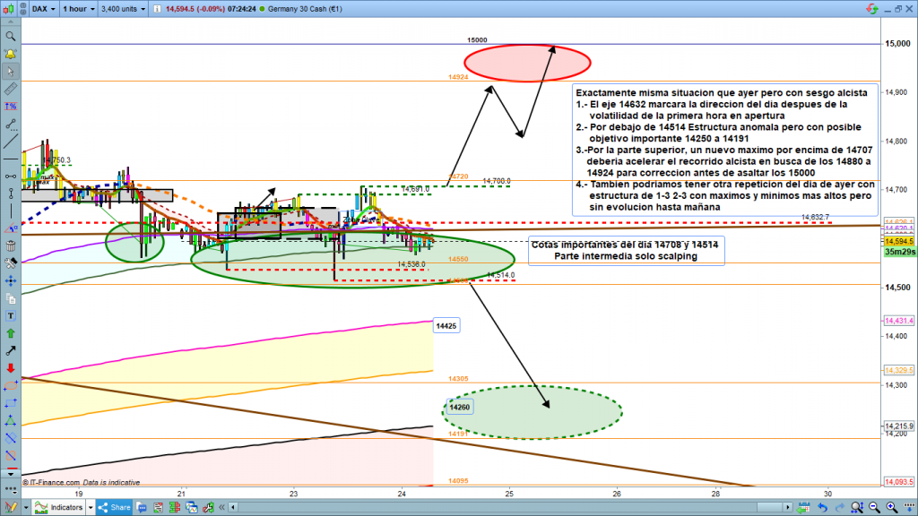 En el gráfico de 1 hora del dax30, vemos el escenario de todo lo comentado anteriormente. El hecho de tener una posible estructura esperada como muy probable, solo debe servirnos de guía, a la hora de la colocación de los Stops Loss y Take profits en las diferentes estrategias que nos marquemos. Sin embargo solo entraremos a mercado después de claras validaciones, o estaremos muy atentos a estas zonas de validación, en el caso de una operativa más agresiva y de riesgo, tipo scalping, que pretendamos convertir en posible recorrido Intradia. Situación exacta a la de ayer, solo que hoy con ligero sesgo alcista, salvo sorpresas de estructura muy compleja con ondas X de teórica onda 4. De ahí, la paciencia y esperar las aperturas de trade después de validaciones. De lo que se trata es de ser rentable, no de estar horas dentro del mercado. Zonas a vigilar a primera hora la situación de la cotización dax versus 14632, por arriba 14708, si antes no ha perdido los 14514, podríamos tener rally importante a nuevos máximos históricos. En caso de perdida de los 14514, muy complicado definir una estructura probable, pero el objetivo sería la zona 14260 a 14191, zona de corrección semanal. Podríamos tener también un día con repetición casi exacta, sin nuevo mínimo, de lo ocurrido ayer, patron PA, hasta r5, y vuelta a PA, para estructura 1-3, 2-3, dejando para mañana el impulso alcista importante. Espero no haberos liado demasiado con tanta información técnica, y que todo lo explicado os sea útil para vuestra operativa. Mismo PA que ayer. Muchísima suerte y muy buenos trades.