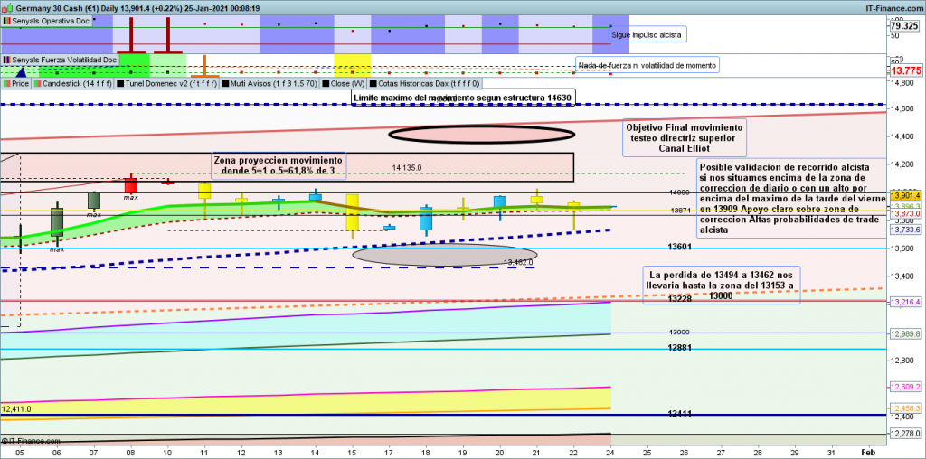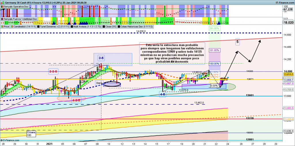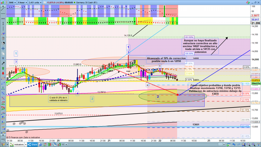 El día siguiente después de las primeras olas de la estructura en gráficos más pequeños, ya podía afinar más la zona objetivo, así definía 3 zonas básicas como objetivo de cambio de dirección por finalizar estructura bajista 13790,13750 y 13715, y que iba a depender de la volatilidad del momento en que la cotización dax llegara hasta estas zonas. Lo explicaba también con detalle en Análisis viernes 22 de enero.