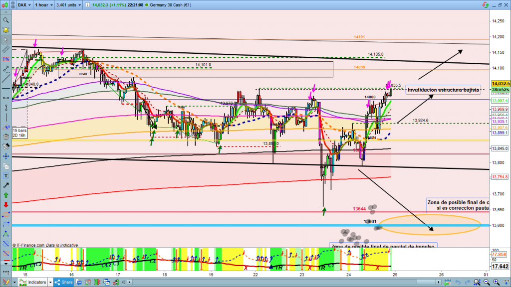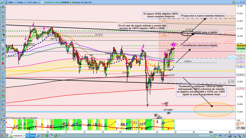Primera zona a vigilar 14035, en caso de superarla (no con pluma), nuevo objetivo 14072 a 14122, esta última, directriz importante en el corto plazo. En el caso de quiebre y clara validación de 14122, el objetivo es por encima de los 14200, por tanto, nuevo máximo histórico, con más que posible extensión de cierta importancia unos puntos más arriba, 14280 a 14305. Resumiendo zonas a vigilar y de toma de decisiones, ya que cada una de ellas es zona objetivo: 14035, 14122 y 14220 a 14280-14305. Esto por la parte superior. En el caso de que la cotización dax, después de cubrir el objetivo de ayer entre los 14000 y los 14035, volviera a camino bajista, mucha atención de nuevo en secuencias de máximos y mínimos. Solo con la perdida con clara validación de 13830, trade ya de ciertas garantías importantes hasta la zona objetivo ya hace días trazada. Primer objetivo en zona bajista 13644 a 13570 con eje en 13601 cota histórica importante. En caso de perdida con validación de la zona del 13570, segundo objetivo bajista en 13494 a 13440, que confirmaría ahora si ya una estructura claramente bajista. Si os fijáis tenéis todas las zonas clave tanto por arriba como por abajo, para una operativa con cierta seguridad.