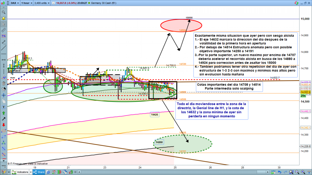 Ayer de nuevo día neutro y con menos recorridos aun que el pasado lunes, también dentro de la zona acotada, sin marcar camino. En el gráfico de 1 hora del dax30 para hoy, podemos ver la situación y movimientos con recorridos mínimos de los dos últimos días. Por tanto, el análisis de hoy sin cambios, seguimos con los mismos escenarios y las posibles estructuras comentadas, así como las cotas de validación de cada una de ellas. En el caso de que se diera la opción superior, con quiebre de la cota confirmada o validada del 14708, mucha atención a posibles giros en la zona intermedia de 100 puntos entre los 14708 y los 14805. Solo con quiebre del máximo histórico tendríamos posterior evolución de estructura alcista, tal como ya comentábamos ayer, zona objetivo de un primer impulso más probable, la zona entre los 14880 y los 14924, antes de nueva corrección. En el caso de la opción bajista, como partimos ya de una estructura anómala, con onda X incluida, el dibujo de esta posible estructura no está tan claro, como siempre dependiendo de si entra precio o no en el mercado. Sin embargo zonas atener en cuenta, la zona 14445 a 14425, y ya por debajo 14350, 14305, 14260 y zona 14200 a 14191. Hoy creo que por fin podríamos tener un día operable con recorridos, aunque a esta hora no sé, si más bien es un deseo o una opción clara de mercado, ya que la entrada de fuerza en el mercado no es un momento predecible. Disponemos de herramientas para detectarla desde el primer momento, pero nunca sabemos cuando se producirá. Tener muy en cuenta para la dirección del movimiento el eje de la zona en 14632, Muchísima suerte y muy buenos trades.