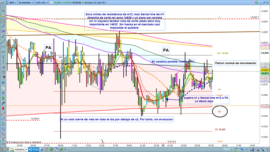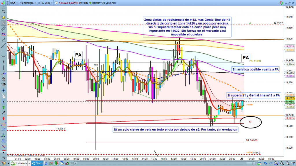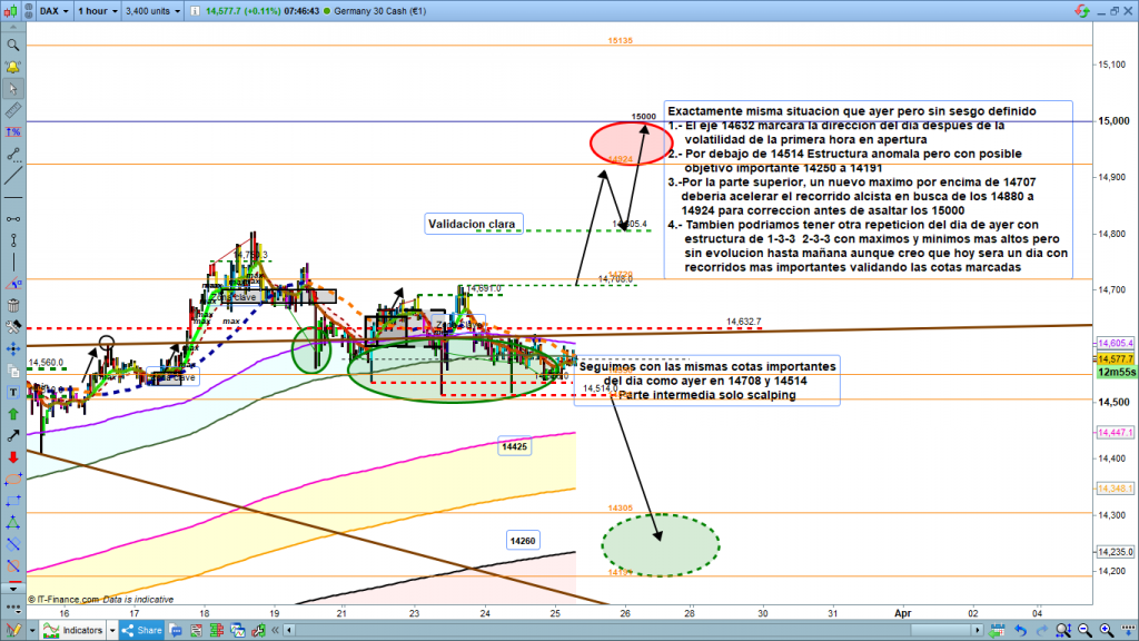 Seguimos coleccionando días de operativa para olvidar. Todo el día en un rango de apenas 50 puntos, entre la zona de pre apertura en los 14598, y la cota proyectada de los 14550, igual que el lunes, pluma de alta volatilidad en la vela de las 9 h. sin nuevo mínimo. Apertura a las 9 h, y cierre a las 10 h, de la vela en 14580. A partir de aquí, un lateral de mínimo rango, prácticamente inoperable durante toda la sesión europea, que se ha animado algo con el cierre de la sesión europea a las 17,34 h, dando un recorrido noble de unos 50 puntos. Tal como comentaba en el día de ayer Análisis Diario Dax 24 marzo 2021, por debajo de la cota 14632, los movimientos más operables serian bajistas, tanto la volatilidad, de las 9 h, como el rally de después de cierre de mercado. Aunque seguro que algún scalper experto, con mucho riesgo, ha cogido parte del rebote de la vela de las 9 h. para volver a PA.