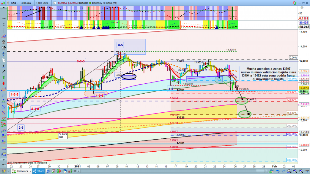 Ya 6 h de la mañana el cierre de la vela diaria de ayer fue en 13718, por tanto dando más probabilidades a la opción bajista. De momento sesión asiática con recorridos volviendo de nuevo a la zona de los 13601 a 13644, que ayer actuó de soporte del movimiento. Un mínimo por debajo del mínimo de ayer en 13597, abriría rally bajista interesante, primeros soportes 13494 y 13462, la perdida con validación, cierres de velas de gráfico importante, nos llevaría a la zona comentada entre 13228 y los 13000, Deberemos ver con mucha atención la estructura dibujada con sus impulsos y correcciones para realizar estudio más conciso, sin embargo, ya de entrada de momento parece que las opciones alcistas hasta los 14400, perderían muchas probabilidades en el corto plazo en el caso de que la cotización dax llegara hasta esta zona 13228 a 13000.
