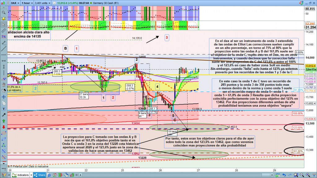 El lunes resulta que en vez de coger fuerte movimiento alcista de onda 3, estructura alcista, hizo todo lo contrario, cogió mucha fuerza bajista, rompiendo el anterior mínimo, y yendo a testear la zona del 13601, cota histórica importante. Este movimiento obviamente cambio la estructura en curso, situándonos no en estructura final alcista como pensaba, sino en corrección mayor empezada en 14135, donde lo que consideraba C de la corrección resulto ser solo A, en la cota 13671, y una onda B, en 14027, y por tanto faltaba estructura de 5 ondas bajista para acabar C y la corrección total. Vamos a ampliar la zona de esta onda C, porque en ella se han producido varios incumplimientos que suelen ser muy difíciles de que ocurran al menos todos a la vez. En alguna ocasión, si que hay diferentes posibilidades y se acaba incumpliendo alguna de las normas o conteos, pero después de haber validado las otras, en el caso de ayer, solo me queda decir que así es el mercado, y que siempre debemos tenerle el máximo respeto Stops Loss y entradas por validación siempre.