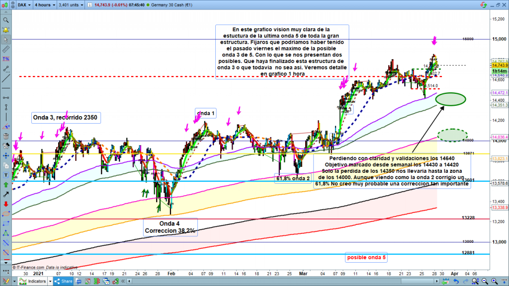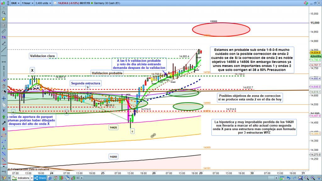En gráfico de 4 horas del dax30, podemos ver la estructura en curso. Onda 5 final de estructura donde ahora estamos dentro, o acabo de finalizar el pasado viernes, en onda 3 de esta onda 5. Creo que la imagen enseña de una forma clara la situación del precio. Lo que intentaremos determinar en el gráfico de 1 hora para la operativa de hoy, es si esta onda 3 de 5 ha finalizado o todavía le queda algún impulso antes de finalizar. En el caso de que haya finalizado, ver como todo el estudio desde gráfico semanal, que nos enviaba el pecio hasta la zona 14420 con posibles plumas por debajo hasta la zona cercana a los 14000, parte inferior de la corrección de semanal, tendrían todo el sentido del mundo. Pero obviamente esto no debería pasar hoy por tanto paso a paso