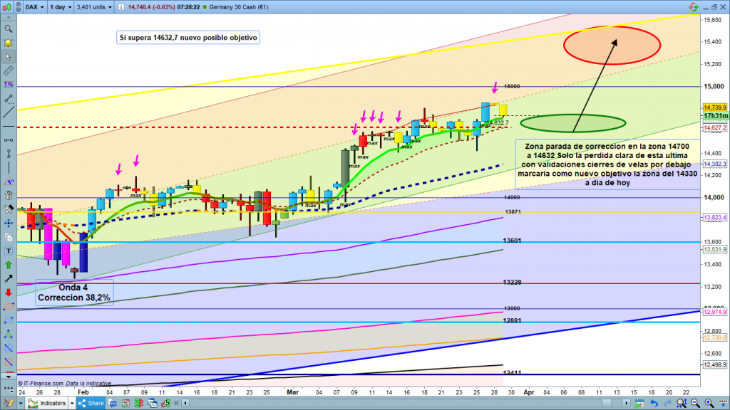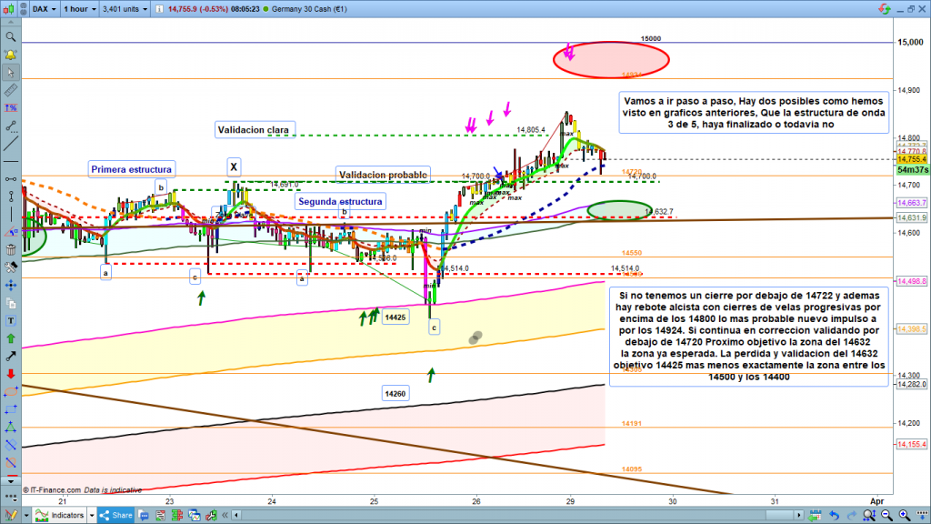 Para la operativa del día, en gráfico de 1 hora del dax30, la situación es clara. Tenemos dos posibles, y la zona actual en pre apertura marca la zona de decisión. O le queda un nuevo impulso antes de corrección más importante, opción operable con cierres de velas por encima de los 14800, objetivo la zona del 14924 a 15000. o estamos en corrección. En el caso de estar en corrección, también dos posibles, o corrección menor, con validación debajo de los 14722 (no plumas de volatilidad de las 9 h), hasta la zona del 14632. O en el caso de perder esta última cota, con validaciones claras, cierres de velas progresivas por debajo de 14632, objetivo la zona entre los 14500 y los 14400, con eje importante en la última zona de corrección en 14425, coincidente en cuanto a posible objetivo en todos los gráficos grandes. El mercado siempre es equilibrio, pese a que para los neófitos pueda parecer un caos, es puro equilibrio, cualquier estudio completo con diferentes temporalidades, acaba dando siempre la misma información. Resumiendo zonas a vigilar por arriba 14800, por abajo 14722 y en su caso 14632. Muchísima suerte y muy buenos trades.