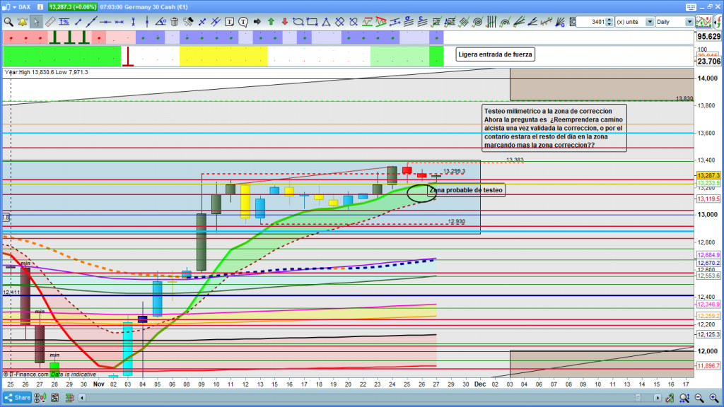 En gráfico de diario del dax30, el movimiento lateral de ayer, hizo que la cotización dax, testeara ya la zona de corrección validando de entrada ya el recorrido sin realizar un desplazamiento hasta zonas más inferiores esperadas. Esto nos deja una situación para la operativa de hoy viernes, más compleja y complicada si cabe. La única noticia positiva es la entrada de fuerza en este gráfico que es el que suele marcar los buenos recorridos. Sin embargo, para el día de hoy, se mantienen las mismas dos opciones, que ya esperábamos ayer, pero hoy sin una con más probabilidades que la otra. O ha finalizado la corrección con el testeo en la sesión asiática de hoy y reemprende camino alcista, o seguimos en terreno de corrección con más o menos lateralidad entre las cotas 13262 a 13228, vamos a ver si los gráficos de estudio para la operativa del día nos dan alguna pista más.